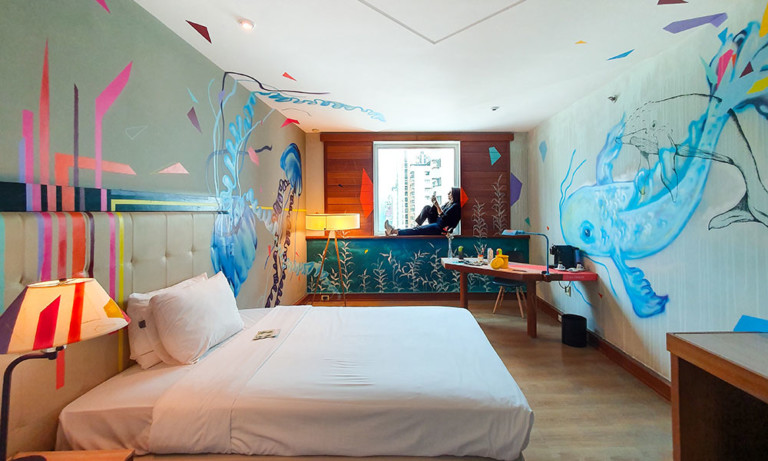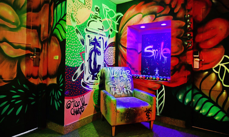 Segundo ele, em seu processo criativo o segundo passo foi escolher o tema. A ideia foi trazer a urbanidade de São Paulo para dentro do hotel, até por conta de sua localização. “A experiência do hospede tinha de ser algo que ele se encontrasse em uma metrópole que está entre as mais importantes da street art do mundo. Foi aí que veio essa história de trazer essa identidade do grafite, os desenhos, as letras, as cores”, diz.