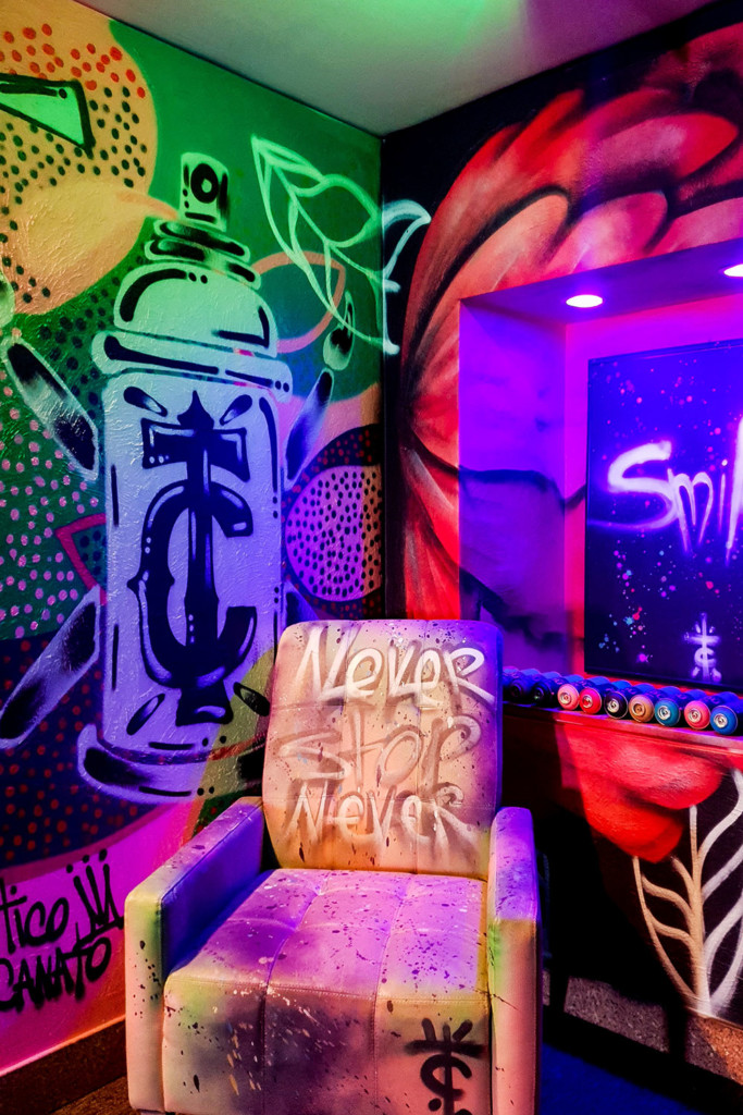 Em sua arte, o grafiteiro usou 100% spray, e como já dito, nada foi desenhado antes nas paredes. Canato, inclusive, fez uma poltrona e uma TV, além de um dos elevadores, cuja experiência de viagem de um andar para outro torna-se uma coisa psicodélica, com luz neon. Ele conta que tudo foi muito orgânico, as coisas foram acontecendo.