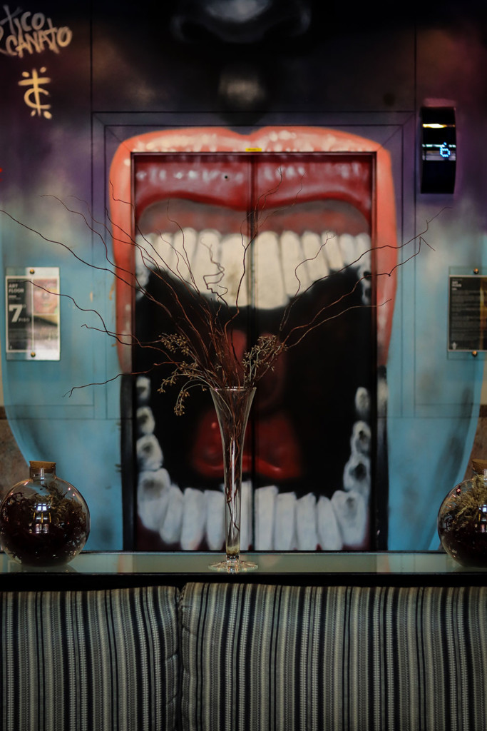 “O Pestana é um hotel que tem tanta história, que seria muito pequeno fazer algo dentro de um quarto apenas. E a ideia de fazer as paredes dos corredores e elevador foi aprovada”, conta Canato.