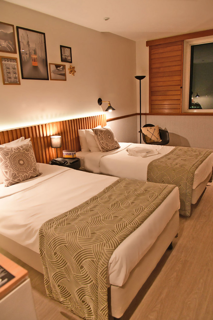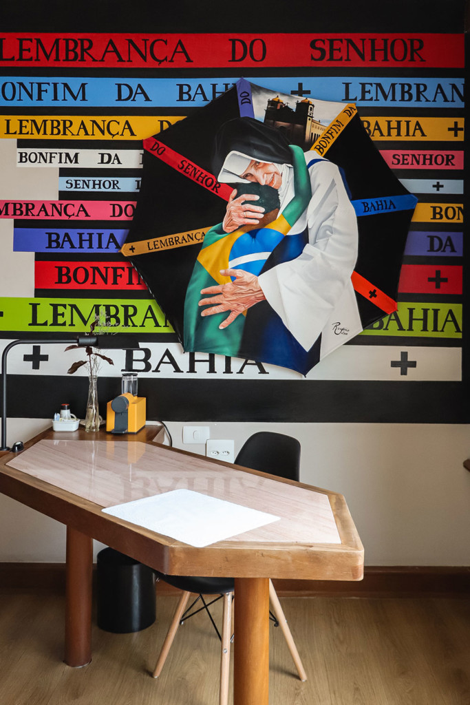 “Cada ambiente conta uma história que tem a sua singularidade, começando logo no lobby com uma intervenção feita pelo Davi Rezende por meio de upcycling que tem como objetivo alertar as pessoas para uma conscientização sobre os aspectos de sustentabilidade e a importância da reutilização dos objetos. No 6º andar há uma referência à nossa origem enquanto grupo português, com fotografias e poemas de autores portugueses, com uma parede toda preenchida com sardinhas feitas em cerâmica à saída do elevador e cujo projeto é da designer Mafê Stacchini. No 7º andar podemos encontrar um ambiente de street art que mistura as cores e os traços tão caraterísticos do grafite, elemento icônico de São Paulo e que foi assinado pelo Tico Canato, que transporta essa identidade para dentro dos quartos, assinando algumas telas e objetos. Já no 8º andar apelidado de ‘Andar com Fé e Axé’, encontramos alguns pontos iconográficos da Bahia que foram desenhados à mão pelo artista Elano Passos: do sertão, ao farol da Barra, ao centro histórico de Salvador, passando por tradições como a capoeira, a gastronomia, entre muitos outros, e onde também podemos encontrar a tradição das fitinhas da Igreja do Senhor do Bonfim à saída do elevador, onde foi feita uma instalação para que o hóspede possa amarrar e fazer os seus pedidos. Um dos quartos do andar tem uma intervenção feita à mão pelo artista Rogério Silva, dedicada a irmã Dulce, a primeira santa brasileira. No 9º andar encontramos dois quartos assinados pela Nah Pinheiro, trazendo como base de reflexão os elementos água e terra, numa viagem por meio das cores e do simbolismo”, conta Pedro Botelho, marketing manager do grupo.