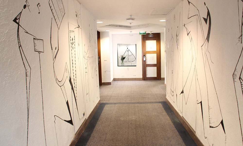 “O Pestana é um hotel que tem tanta história, que seria muito pequeno fazer algo dentro de um quarto apenas. E a ideia de fazer as paredes dos corredores e elevador foi aprovada”, conta Canato.