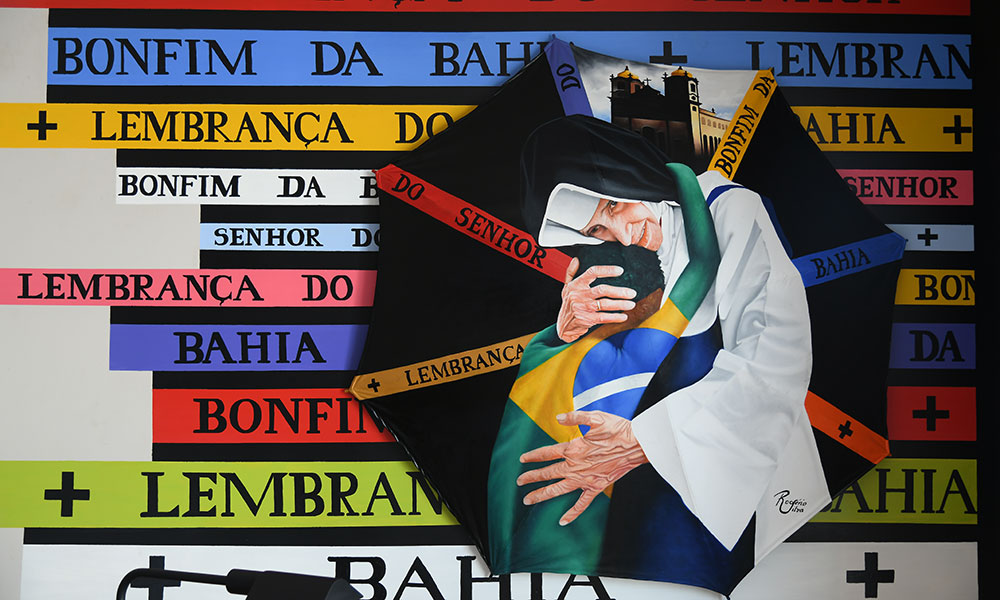 Sobre criar para um hotel, o artista baiano diz que o primeiro passo é entender que o local vai receber muitas pessoas, com suas vivências e experiências diferentes, mas que ao mesmo tempo deveria remeter ao seu conceito que era a Bahia. “Eu pensava muito em como eu ia transportar a pessoa para a Bahia, como as pessoas iam andar naquele corredor como se fosse realmente a Bahia?”, explica. Mas se ele se questiona a respeito, sua arte disse tudo. Andar pelos corredores é uma viagem pela capital baiana. “Eu trabalhei com elementos icônicos, como o Farol da Barra, a própria Iemanjá, a Igreja do Bonfim. A preocupação foi o que levar para um hóspede em um hotel em São Paulo que remetesse à Bahia.”