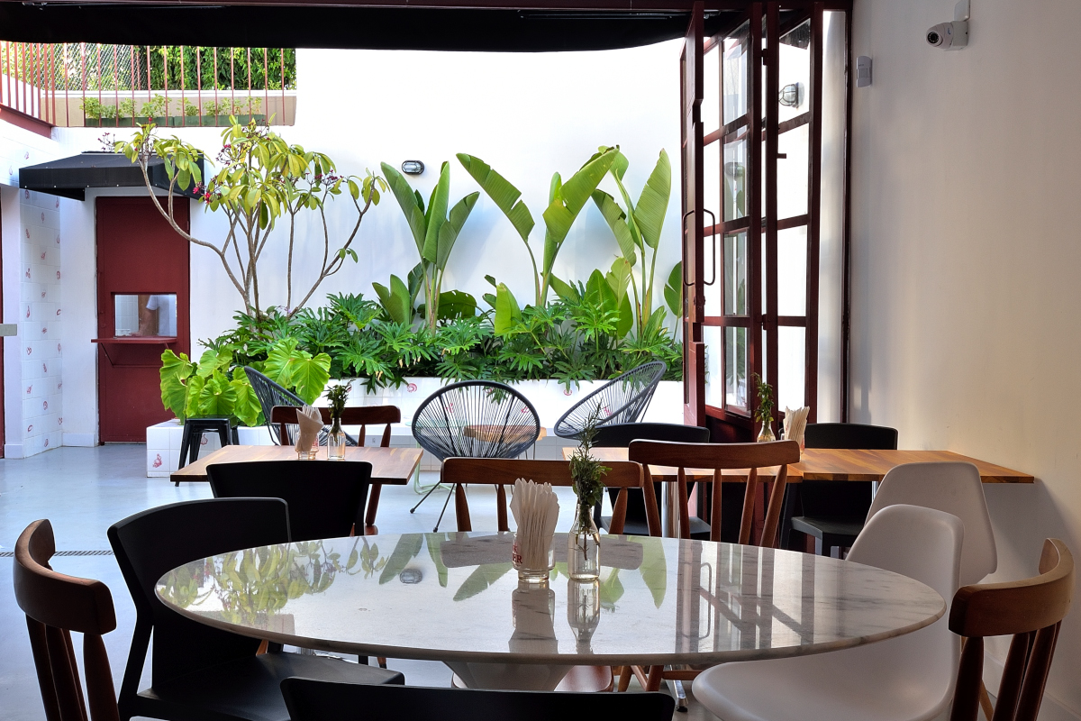 Com azulejos estampados com itens de delicatessen remetem às matérias-primas da cozinha e ao que pode ser comprado e levado para casa, assim como os belos acessórios espalhados pelo ambiente. As plantas e a luminosidade, por sua vez, dão uma sensação de acolhimento.