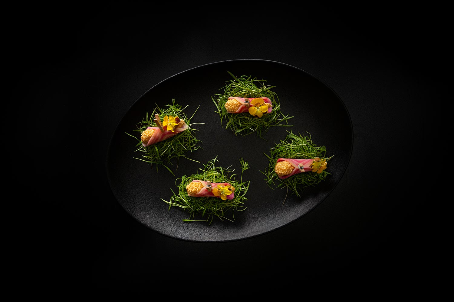 Entradinhas criativas, deliciosas e diferentonas incluem Pancs (plantas não convencionais comestíveis) com feijão manteiguinha, vinagrete de cajá e crosta de pão de milho, caso também da espuma de batata, gema curada, carne de sol, cebola crocante e trufas.