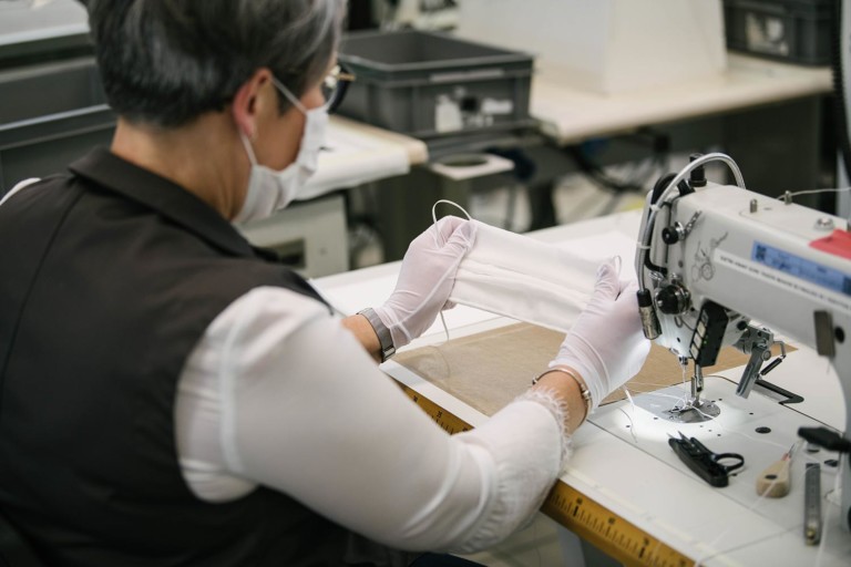 Michael Burke, Presidente e CEO da Louis Vuitton, formalizou o início da produção visitando a oficina de Sainte-Florence, onde vinte e dois artesãos estão alocados voluntariamente e já produzem máscaras que serão fornecidas principalmente para proteger os profissionais de saúde que estão na linha de frente no combate ao Covid-19;