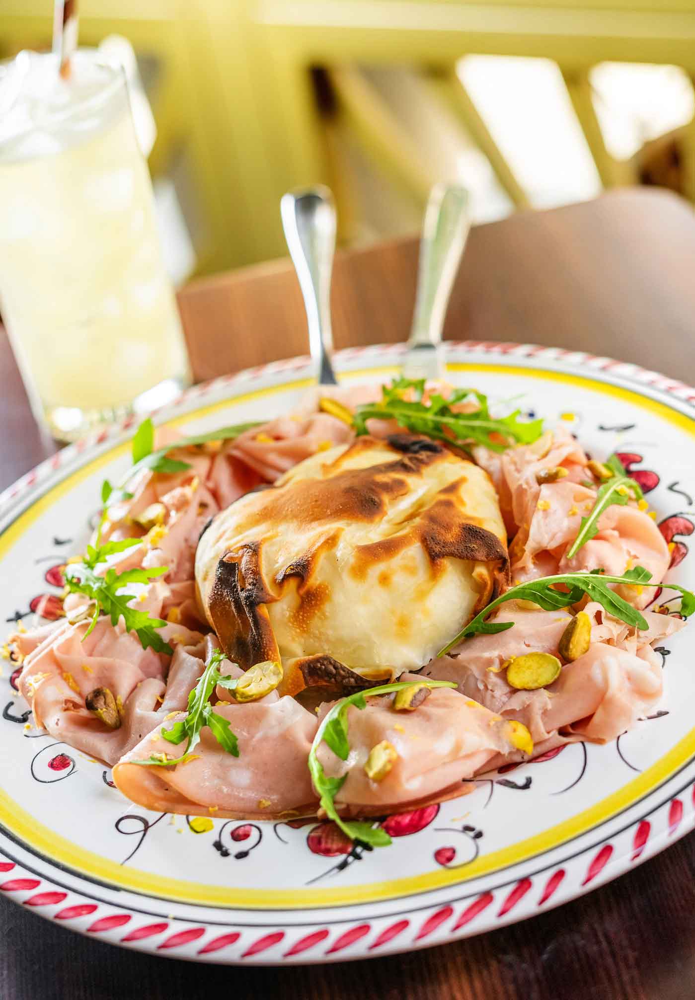 O menu é do chef executivo Marcelo Schomer. Para começar, peça a burrata a legna, de comer rezando, acompanhada de mortadela de Bologna com pistache, molho pesto e limão siciliano.