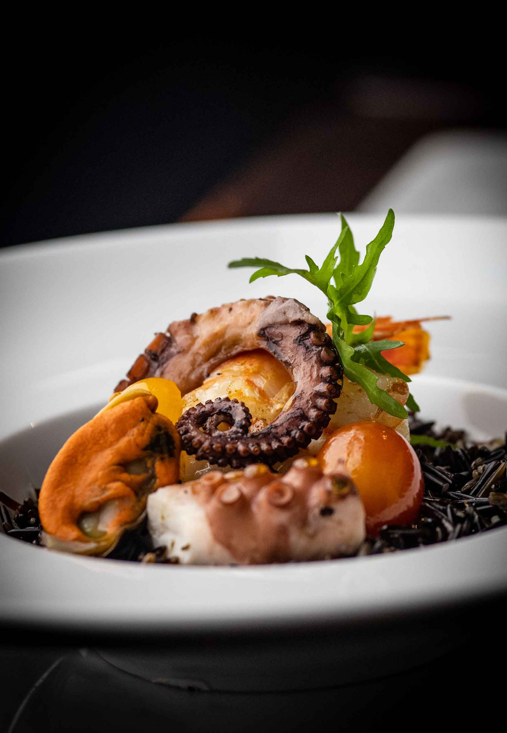 De prato principal, provamos o risoto de frutos do mar com arroz negro que é espetacular. O arroz chega no ponto perfeito, bem puxado no queijo, extremamente cremoso. E os mariscos complementam com perfeição: camarão caprichado, molusco e o polvo cozido no ponto exato.