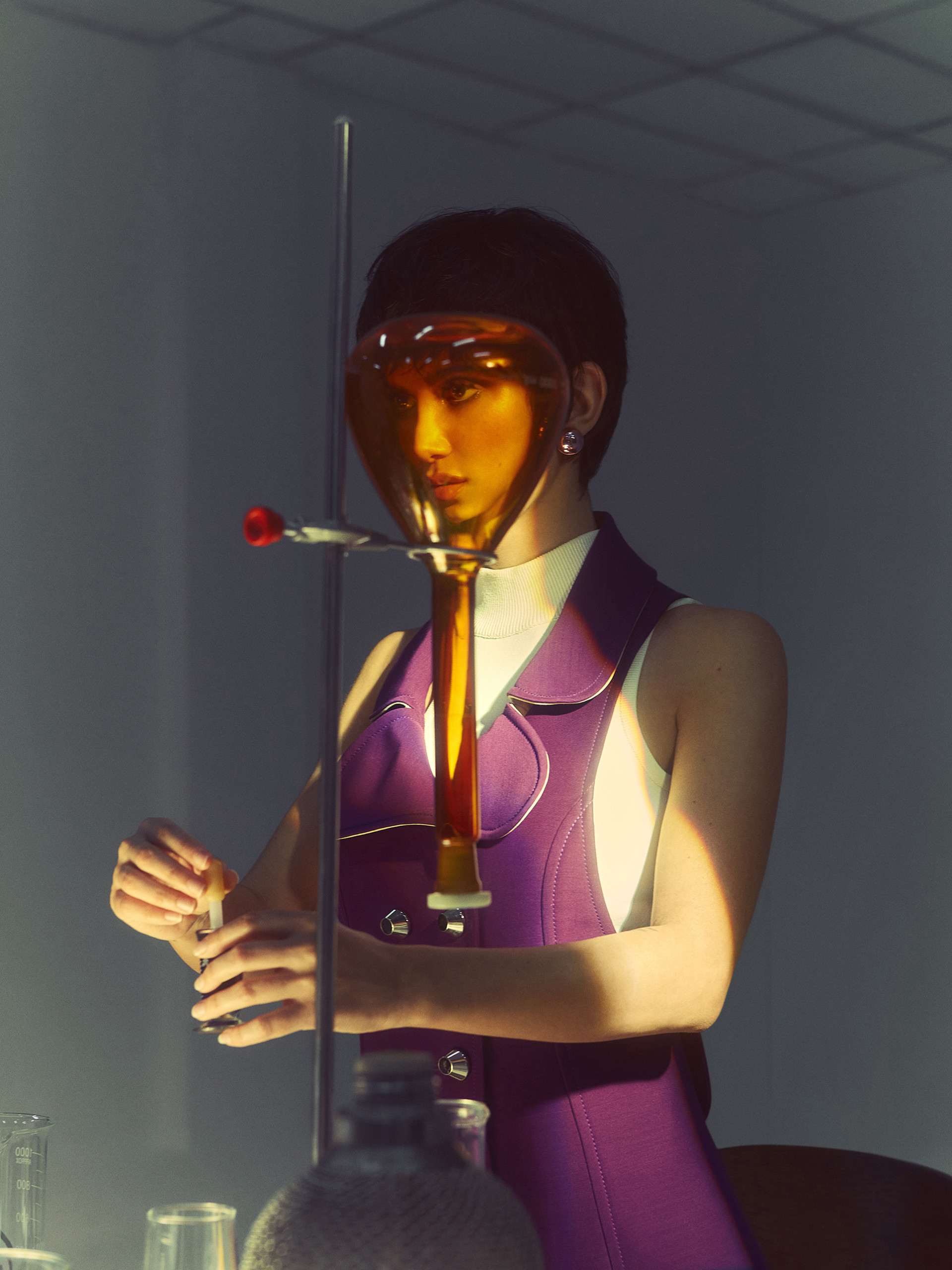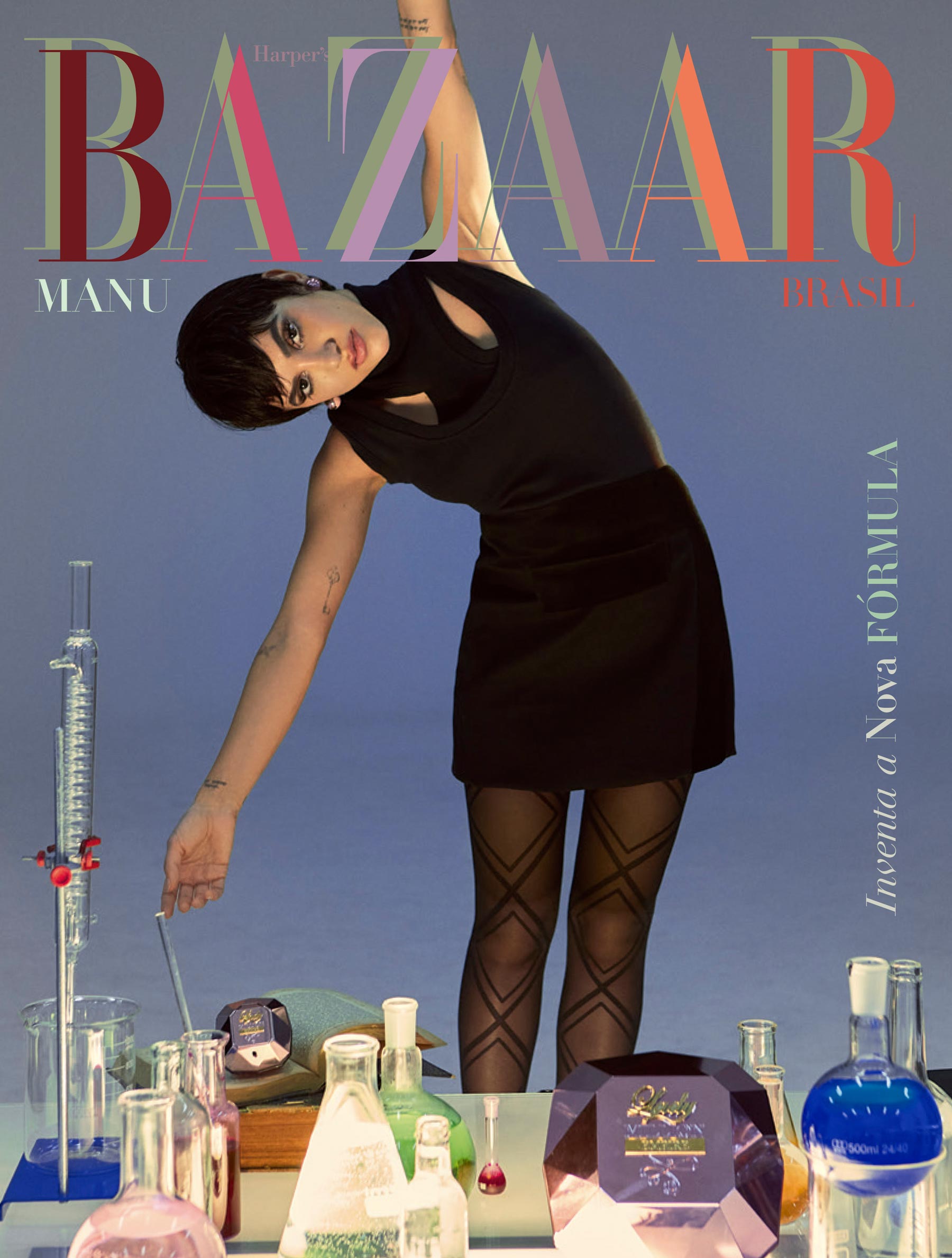 Manu usa top Ben, saia Egrey, brincos Louis Vuitton e meia-calça Calzedonia. No cenário, perfume da Paco Rabanne (@pacorabanneparfums) – Foto: Fernando Tomaz, com direção criativa de Thiago Bastista, styling de Carol Roquuete, beleza de Krisna Carvalho, digital Retouch de Chico Duarte e produção executiva de Bruno Uchôa