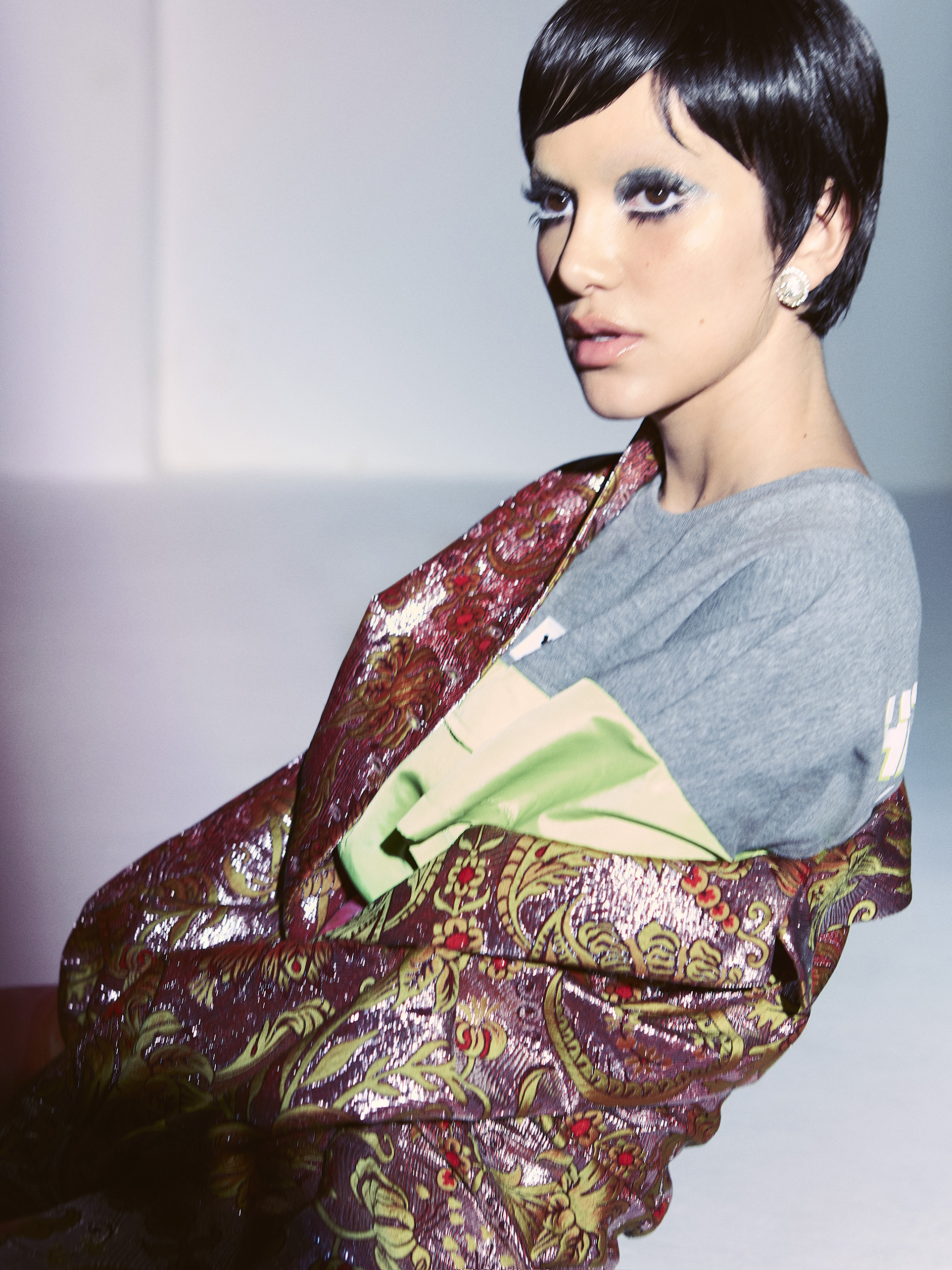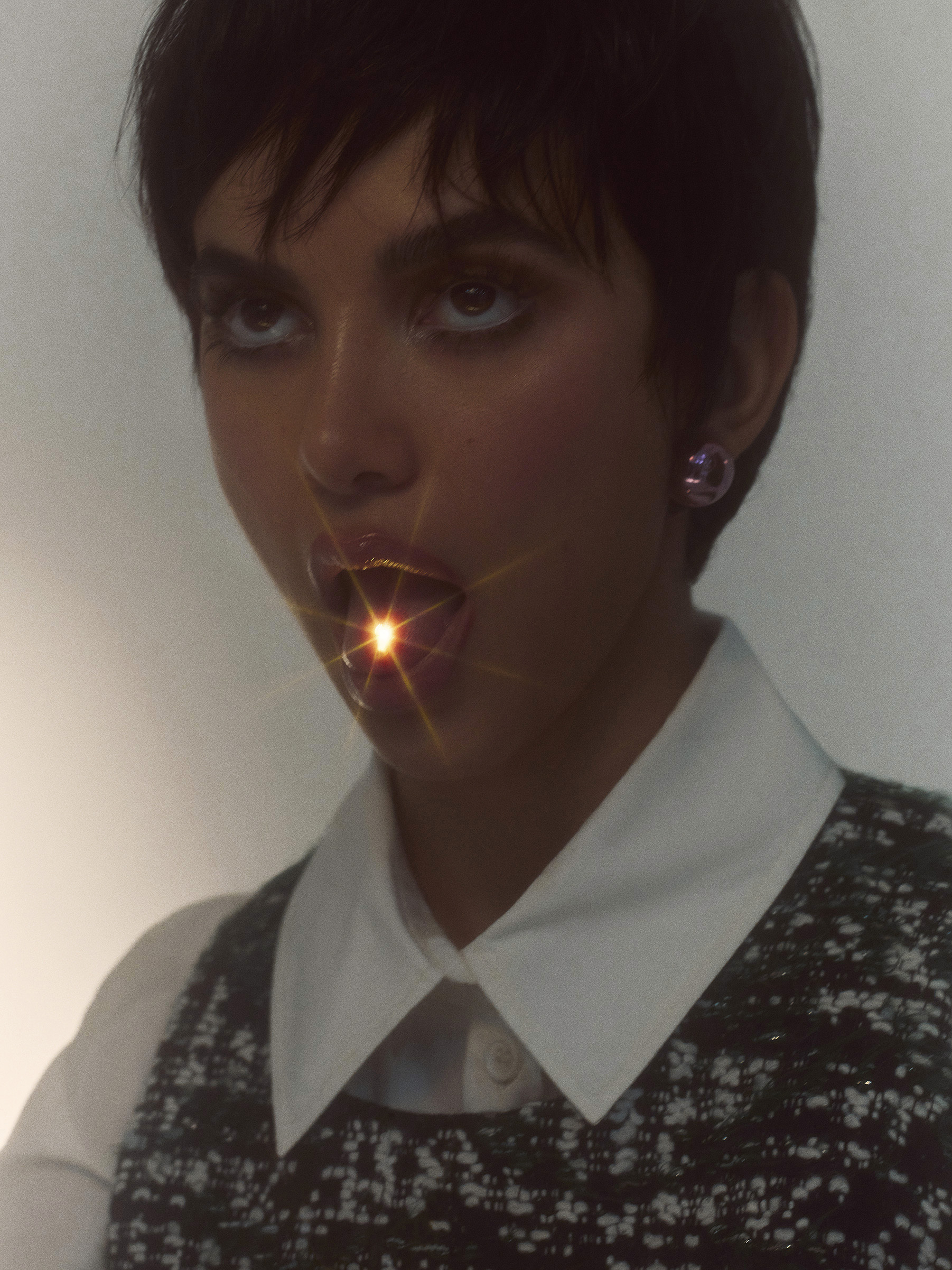 Manu Gavassi usa vestido Colcci, camisa Gucci e brincos Louis Vuitton – Foto: Fernando Tomaz, com direção criativa de Thiago Bastista, styling de Carol Roquuete, beleza de Krisna Carvalho, digital Retouch de Chico Duarte e produção executiva de Bruno Uchôa