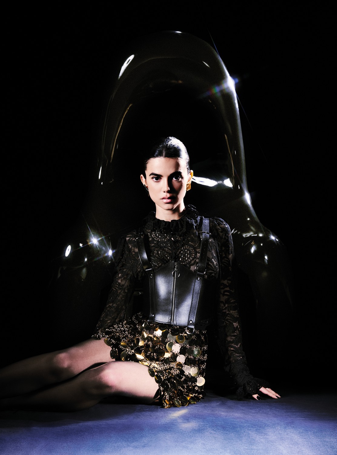 Manu Gavassi usa camisa e saia Paco Rabanne, corset Icona e brincos Karin Reiter – Foto: Hugo Toni, com direção criativa de Raphael Tepedino, styling de Carol Roquuete e beleza Gui Casagrande