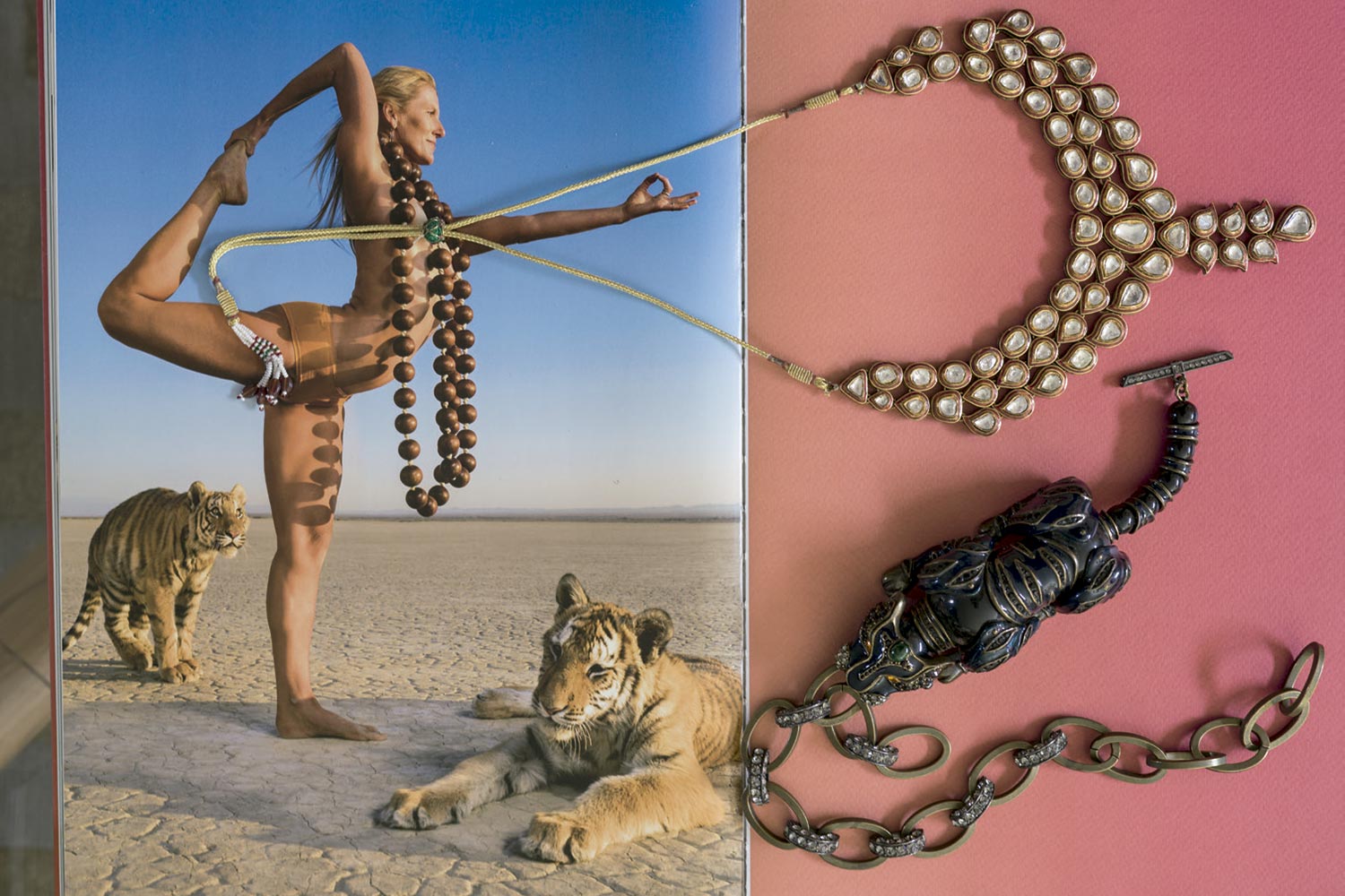 Livro On Yoga, de Michael O’Neill, com colar vintage comprado na Índia e colar de tigre Lanvin – Foto: Christian Maldo