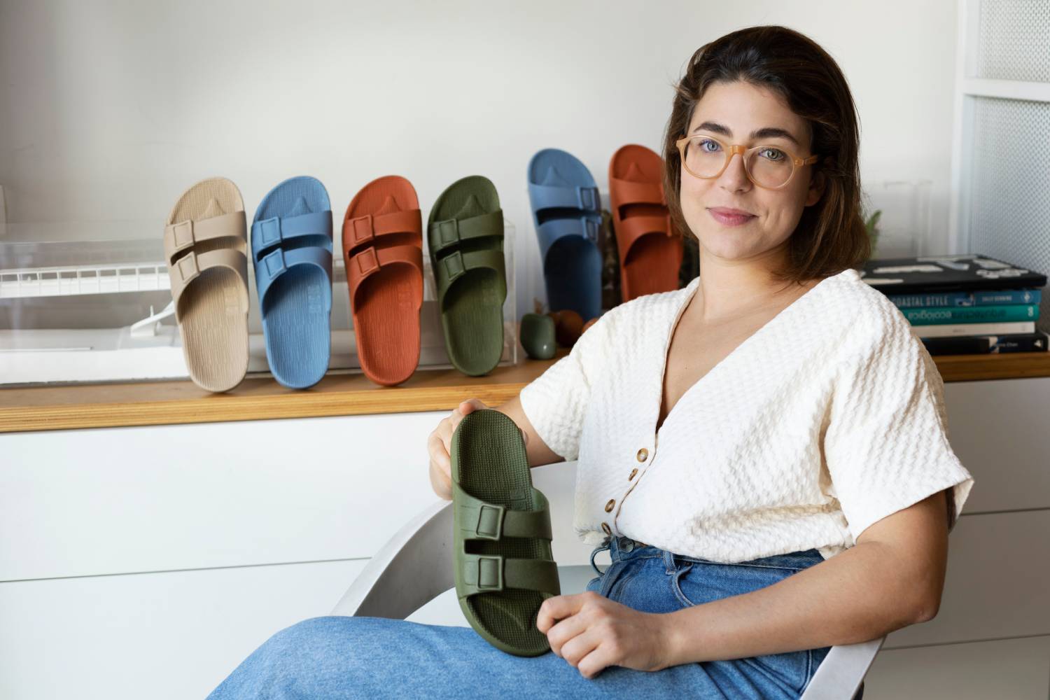 Sem experiência na indústria do calçado, Isabela Chusid usou seu dom do diálogo para encontrar alguém que estivesse desenvolvendo o que ela buscava. E foi em uma empresa de desenvolvimento de novas matérias-primas que encontrou outra mulher que desejava o mesmo que ela. “Nessas de não entender muita coisa, falei que queria algo 100% reciclável, vegano, com o maior percentual de fontes renováveis e a menor pegada de carbono. Não tinha conhecimento das dificuldades e desafios em desenvolver tudo isso, mas juntas, chegamos nessa versão: um PVC mais ecológico, que substitui os lubrificantes e plastificantes de origem animal ou fóssil por óleos vegetais. Viramos inclusive case dentro do nosso fornecedor, porque foi o PVC com maior percentual de CO2 de origem renovável que eles encontraram”, explica.