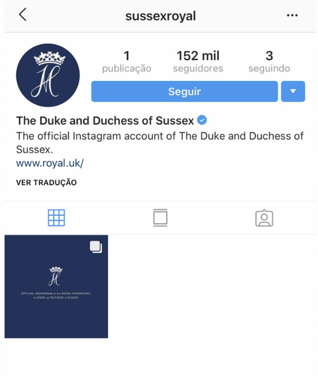 Agora os duques de Sussex têm uma conta no Instagram! “Bem-vindos ao nosso perfil oficial no Instagram; estamos ansiosos para compartilhar nosso trabalho, as causas que apoiamos, anúncios importantes e chamar a atenção para assuntos importantes. Agradecemos o apoio de vocês!”, diz o primeiro post do perfil, assinado pelo príncipe Harry e Meghan Markle.