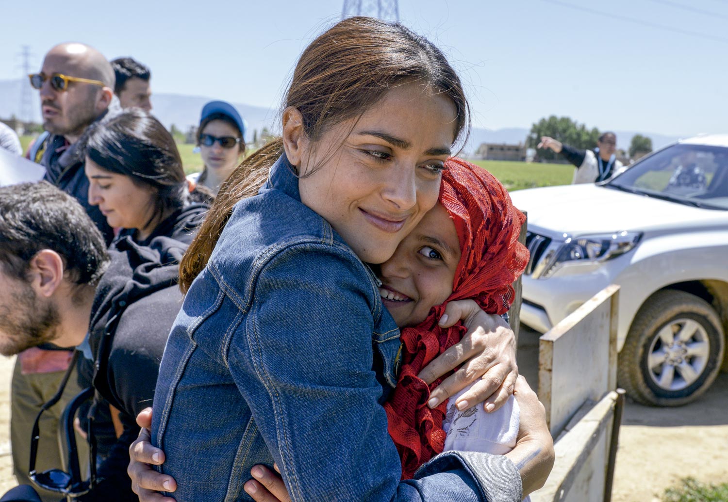 Salma Hayek Pinault visita campos de refugiados sírios no Líbano, através da Unicef e Chime for Change, em 2015 – Foto: Divulgação
