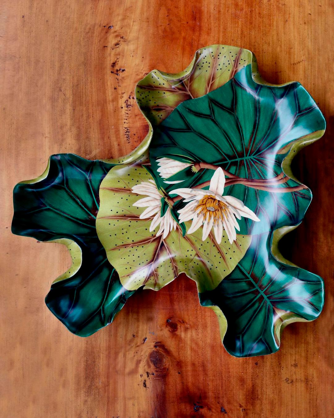 Difícil não se encantar com o resultado. Há bandejas em formato de folhas, vasos com delicados ornamentos inclusive no interior e finalizados com esculturas em pedra de borboletas e beija-flores, porta-retratos, caixinhas, bolas e uma impactante mesa lateral inspirada na vitória-régia, a planta aquática típica da bacia do Rio Amazonas, que vive apenas 48 horas e inspira a romântica lenda indígena sobre a lua e a guerreira Naiá.