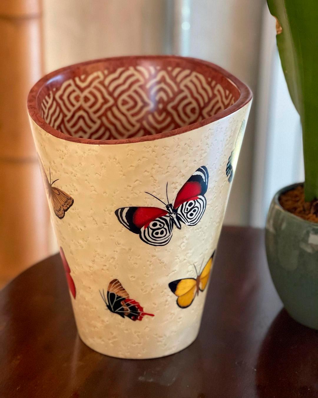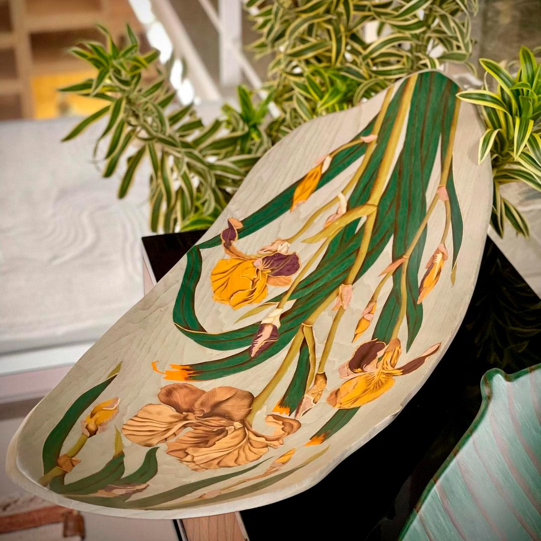 Ela conta que tudo começou como uma brincadeira. Primeiro, experimentou a marchetaria em vaso. Gostou do resultado. Fez outro. Viu que havia um caminho promissor nascendo e resolveu seguir em frente. O mais impactante, diz, foi o encantamento de ver, em grande escala, o que até então vinha fazendo uma dimensão minúscula.