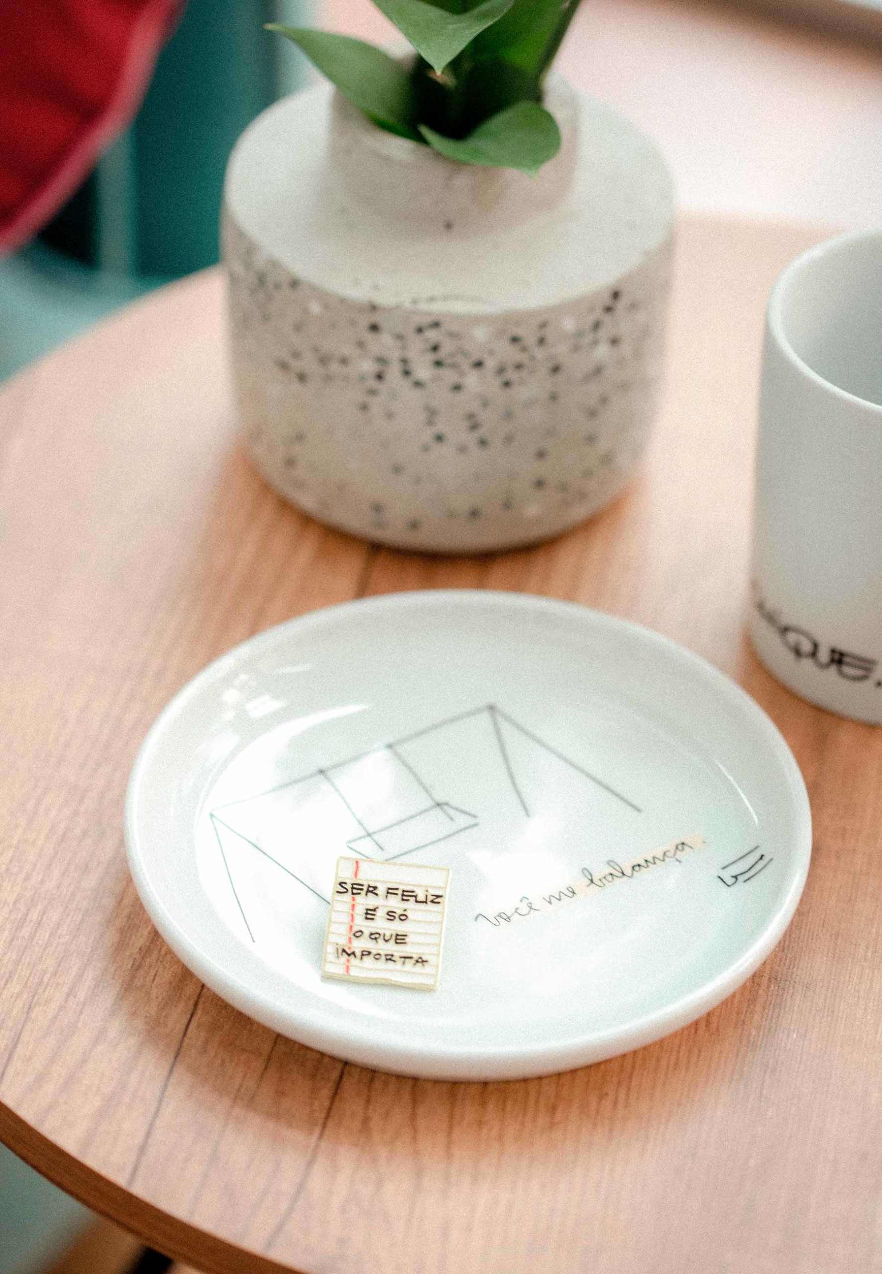 A linha tem pins, espelhos, canecas, pratos decorativos, almofadas e cartões de presente, todos com a identidade característica da empresa, com a presença de palavras e frases que traduzem os sentimentos cotidianos e uma tipografia marcante.
