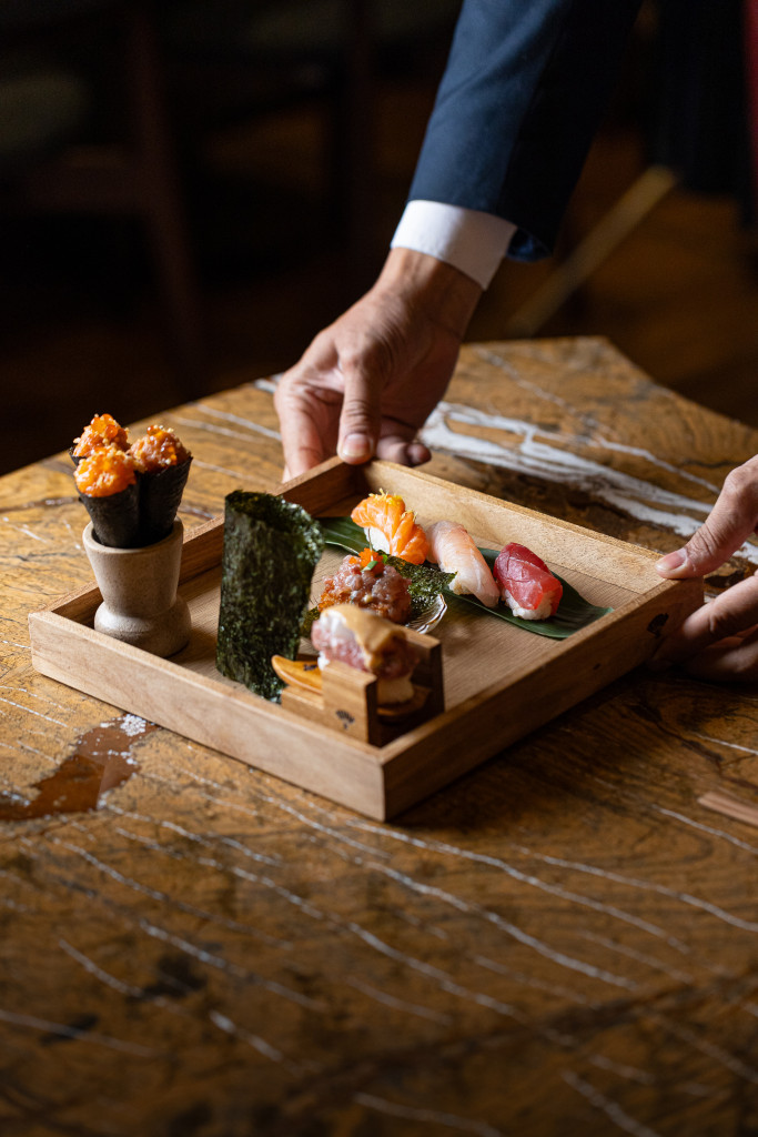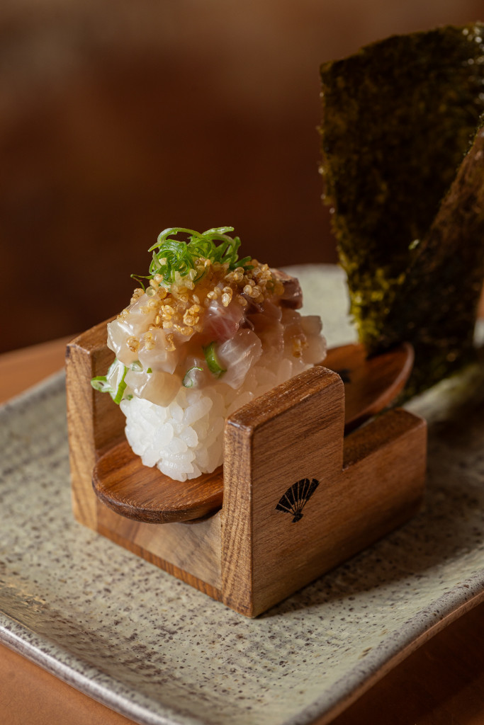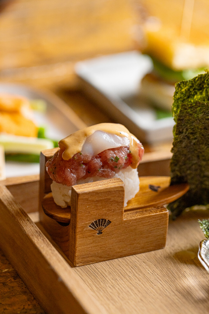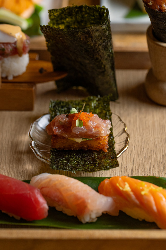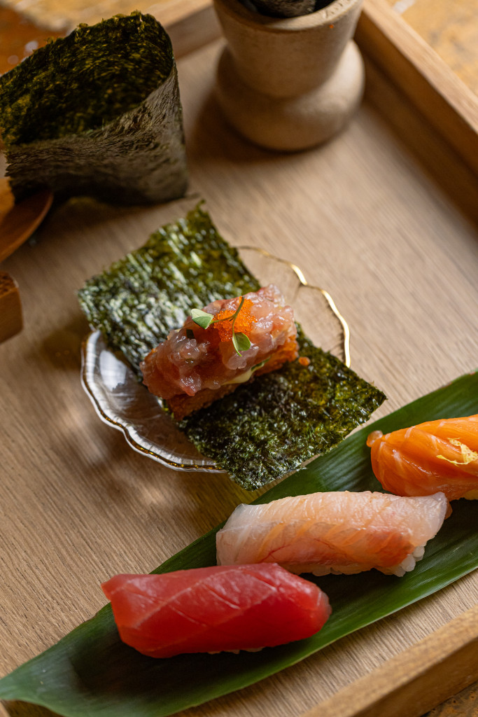 A degustação tem início com duas entradas que expressam a essência do Kitchin: a Mini Salada Kitchin, composta por um mix de folhas, salmão, kani kama e molho especial, e o Sando Wagyu, preparado com pão shokupan, blend de wagyu e cheddar inglês. Na sequência, o sushi bar assume o protagonismo com uma seleção precisa e criativa de preparos: o handroll de atum toro e vieira, finalizado com creme de uni, shari e nori; o trio de mini temakis crunchy, apresentados em versões de atum, frutos do mar e salmão; o sushi moriawase, com barriga de salmão, robalo com manto de katsuobushi e atum akami; além do Crispy Rice Kitchin, que combina shari crocante, peixe branco e molho especial. Como prato principal, o robata de salmão é servido com legumes selecionados, molho de missô e yuzu — uma fusão equilibrada entre técnica japonesa e leveza nos sabores. Para finalizar, a sobremesa é o tiramisú de matchá, que une creme de mascarpone, chocolate branco e chá verde japonês em uma releitura delicada e marcante.