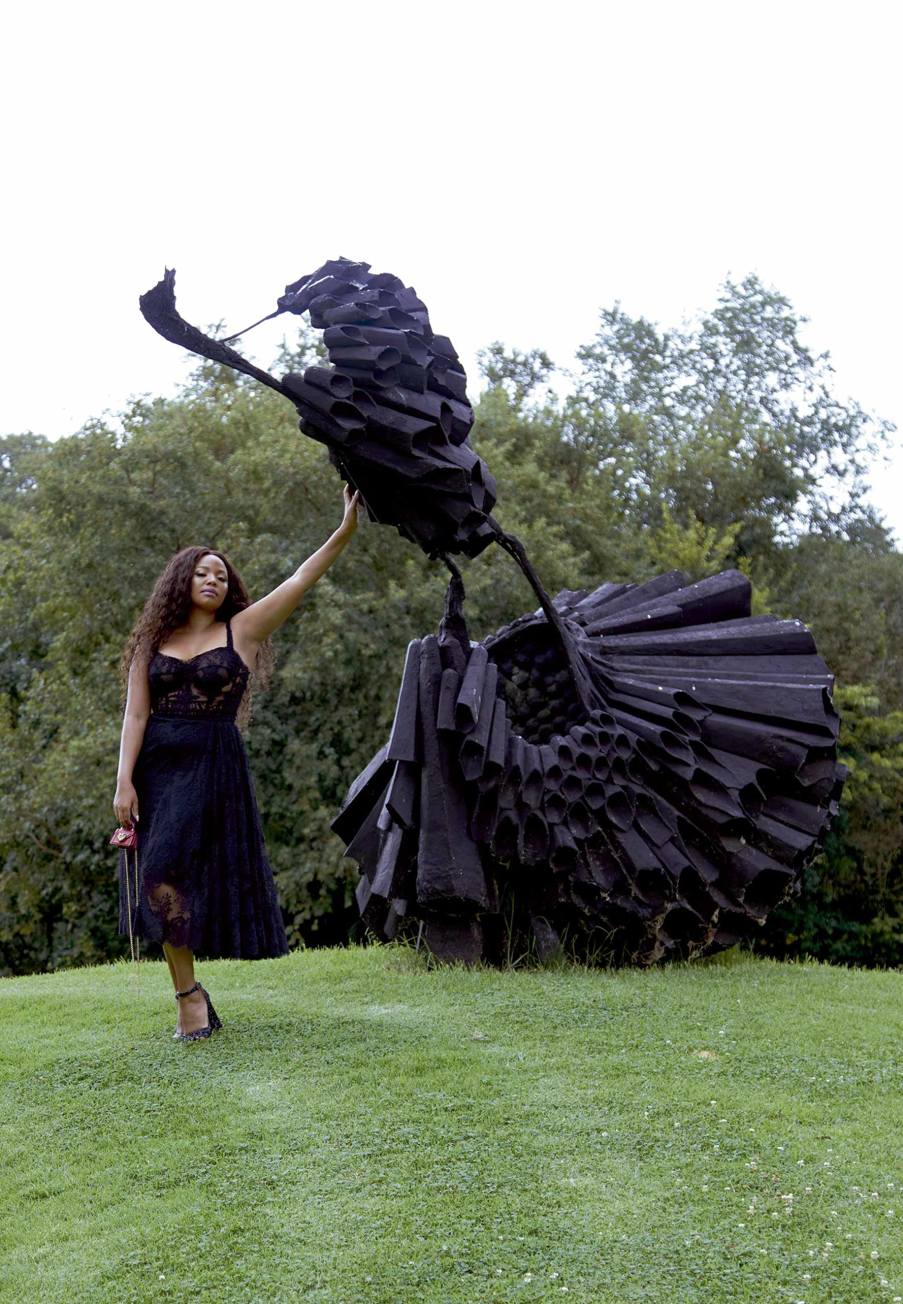 Terry Pheto e a escultura “Dark Codex”, de Richard Forbes.