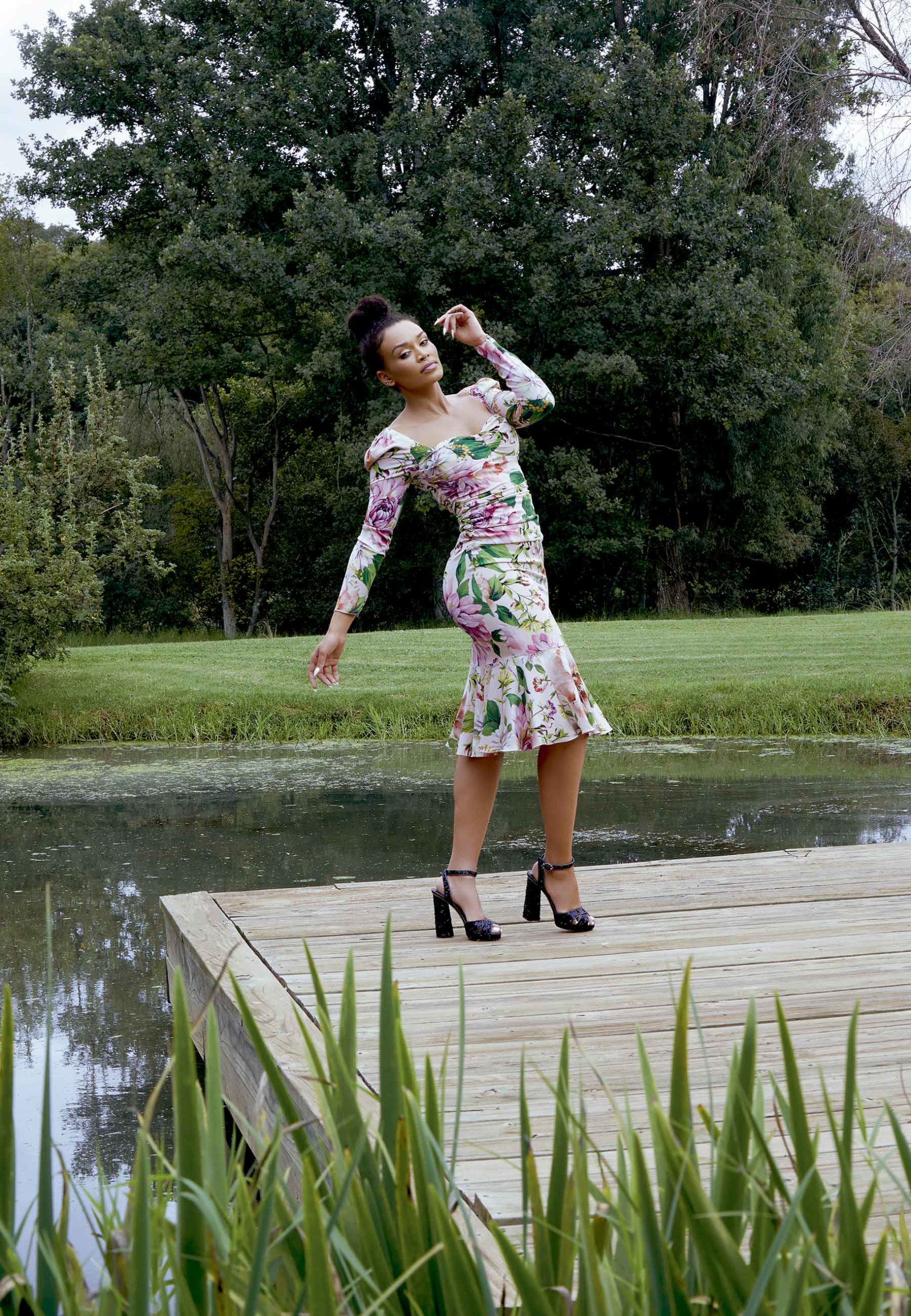 Pearl Thusi no lago da Fundação Nirox.