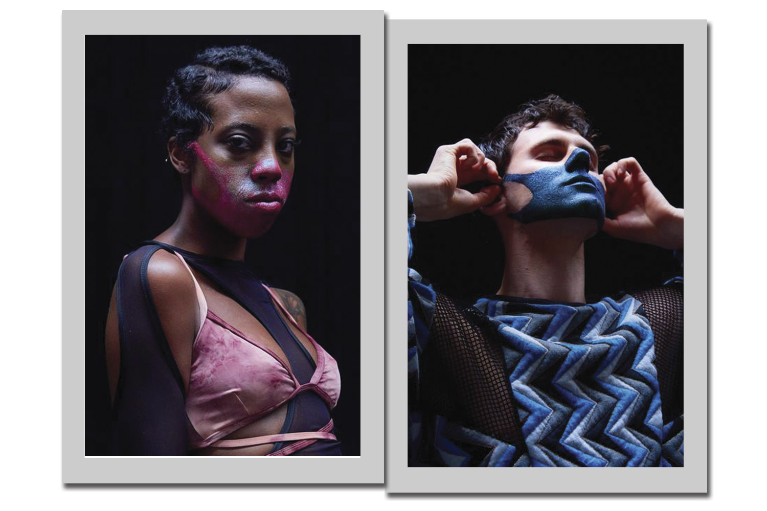 Adoramos a ideia de Rafael Caetano de pintar com muito glitter uma máscara cobrindo a boca de seus modelos.