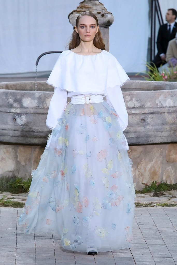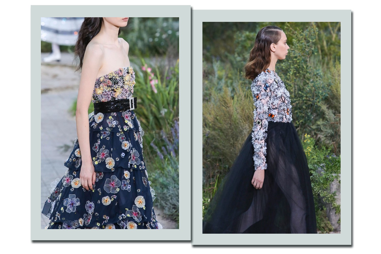 As flores são um símbolo muito forte da casa Chanel, vide as camélias que já são um símbolo registrado. No desfile de alta-costura, é possível observar diversos looks com pequenas aplicações em flores bordadas diretamente no modelo. Esse detalhe traz vida as peças e até um toque lúdico.