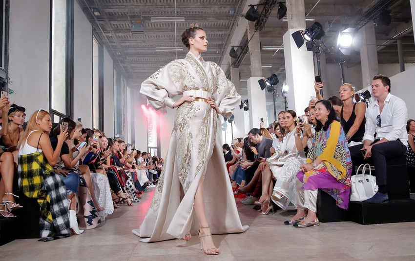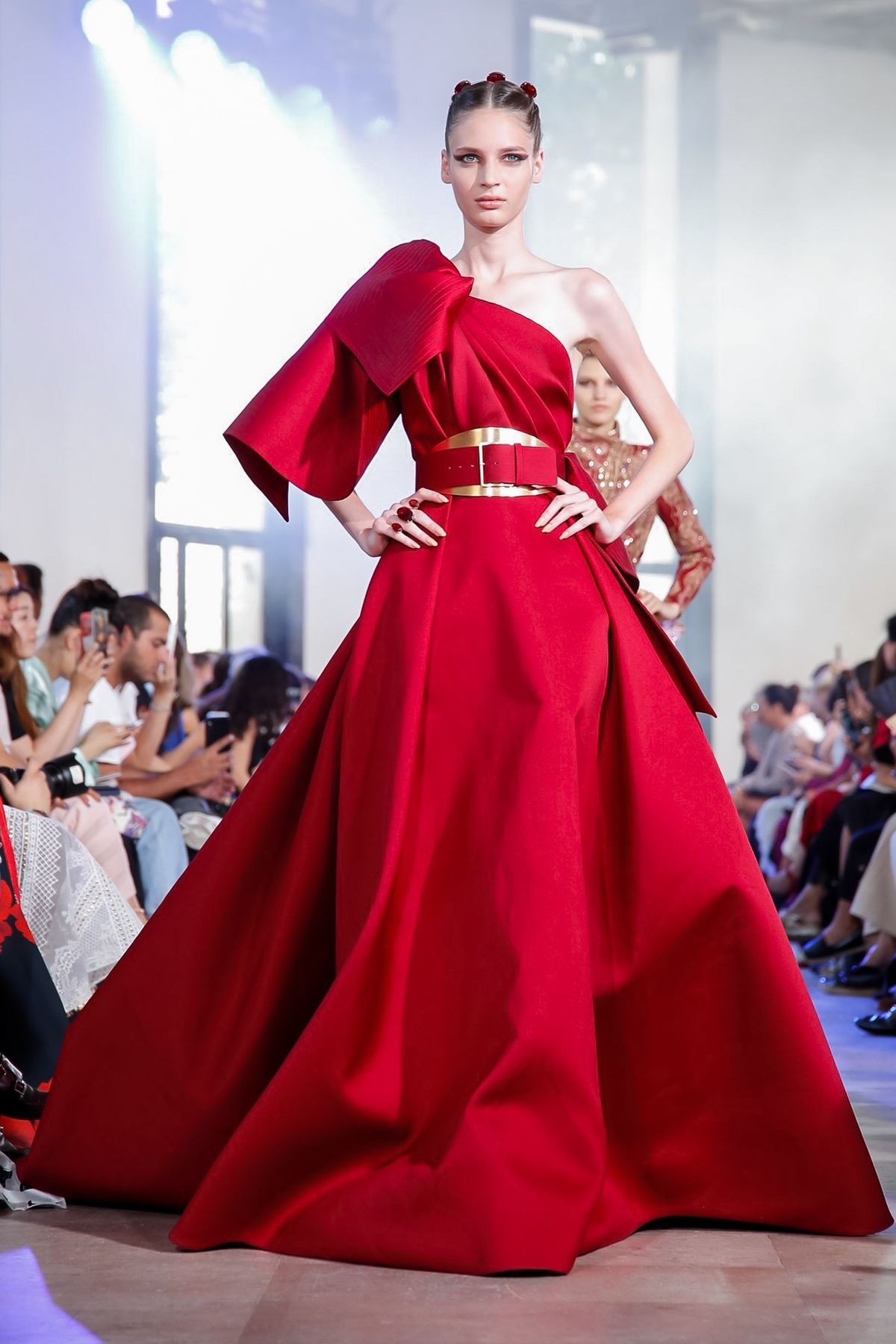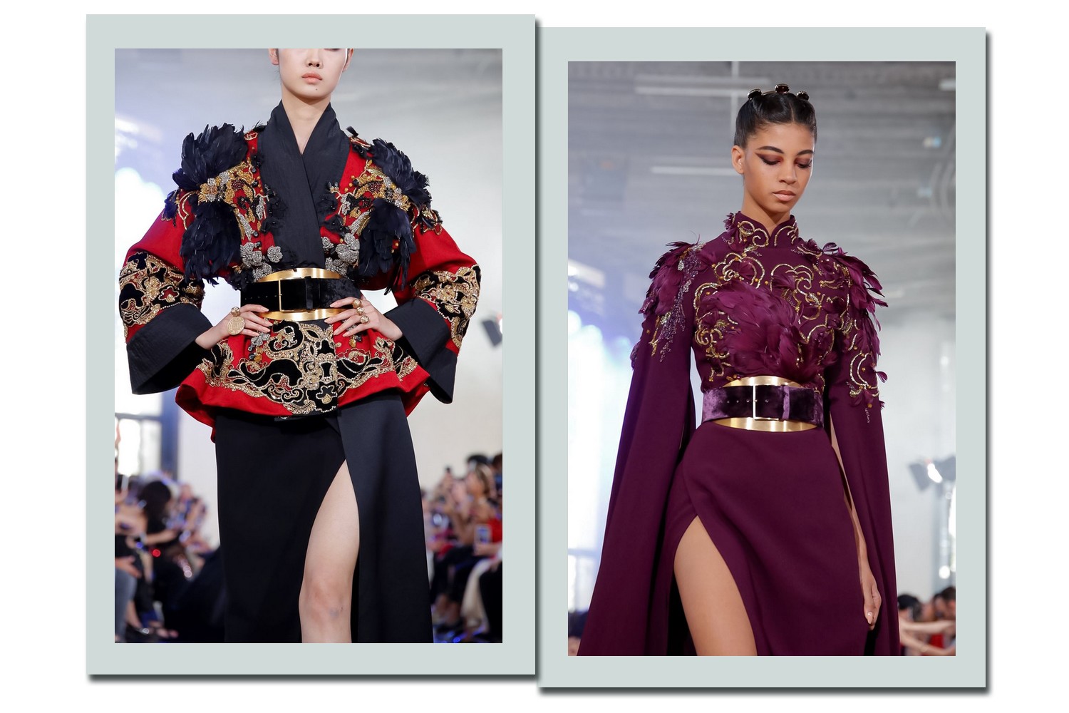 inverno 2020 da Elie Saab busca inspirações em países orientais e traz para a passarela características tradicionais da típica vestimenta japonesa. Os vestidos acinturados lembram quimonos com longas e amplas mangas e poderosos cintos dourados substituindo os laços.