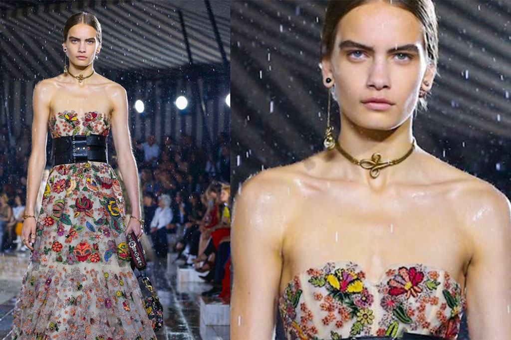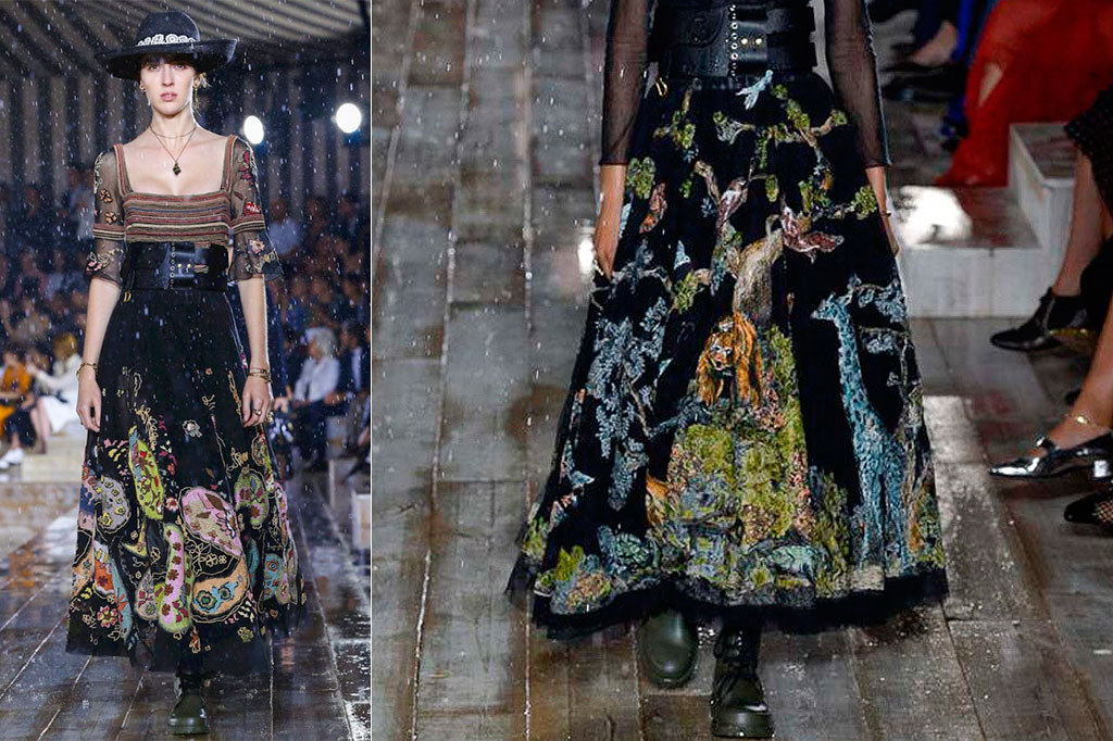 Fauna e flora decoram os vestidos e saias da coleção, nos bordados preciosos que formam ursos, girafas e belas flores e folhagens.
