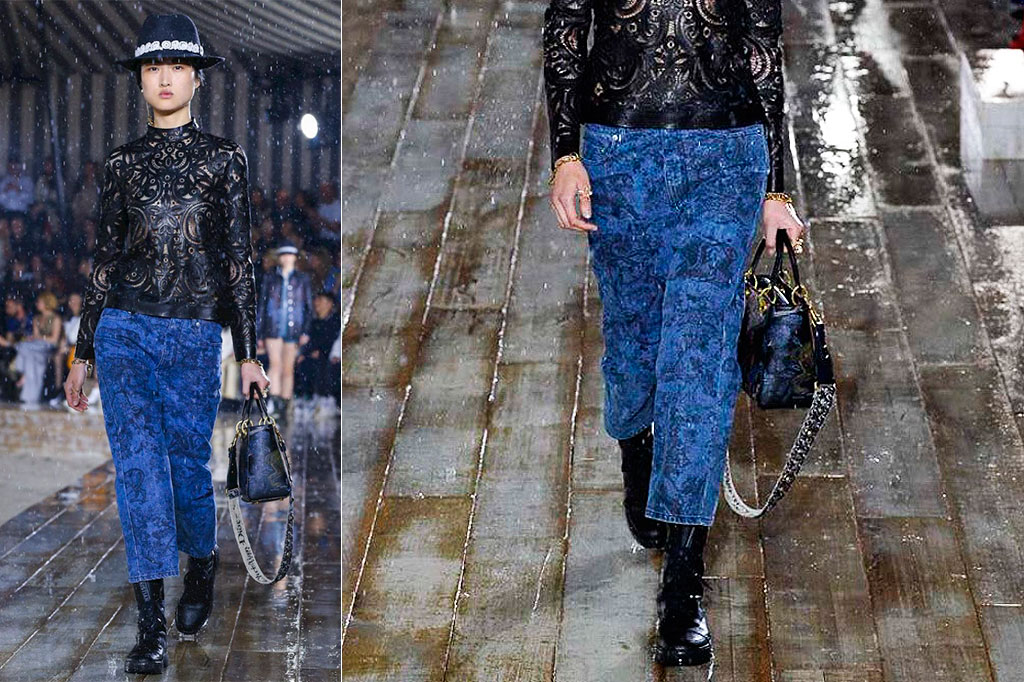 Também em tom azul escuro, o jeans da Dior ganha estampa Toile de Jouy estilizada com animais selvagens.