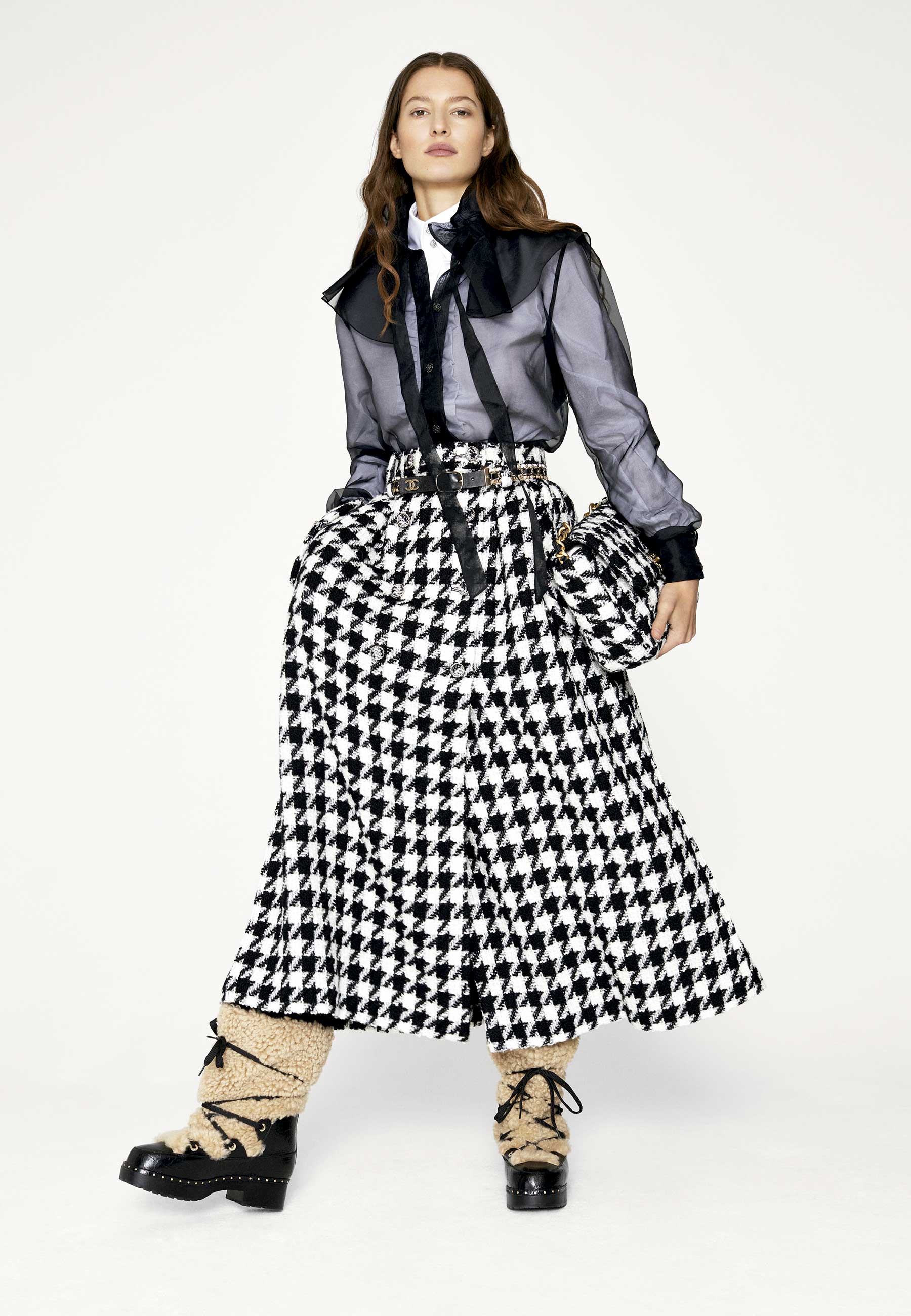 A contraposição de leve e pesado no look é uma brincadeira que resgata a herança da maison Chanel. Aqui, os pesados tweeds são modernizados pela transparência das organzas.