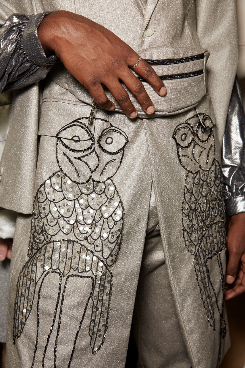A coruja bordada à mão com linha e paetês é um mimo entre os looks poderosos de João Pimenta.
