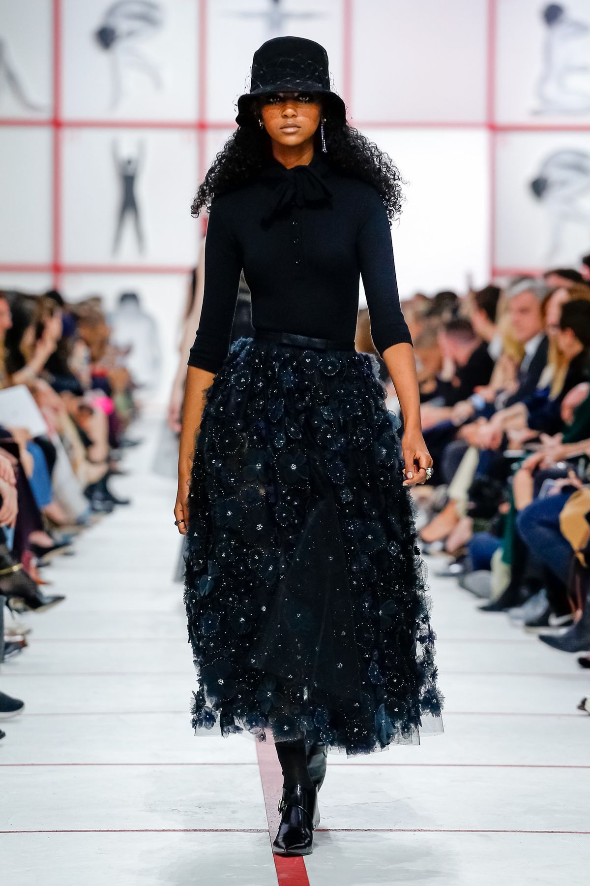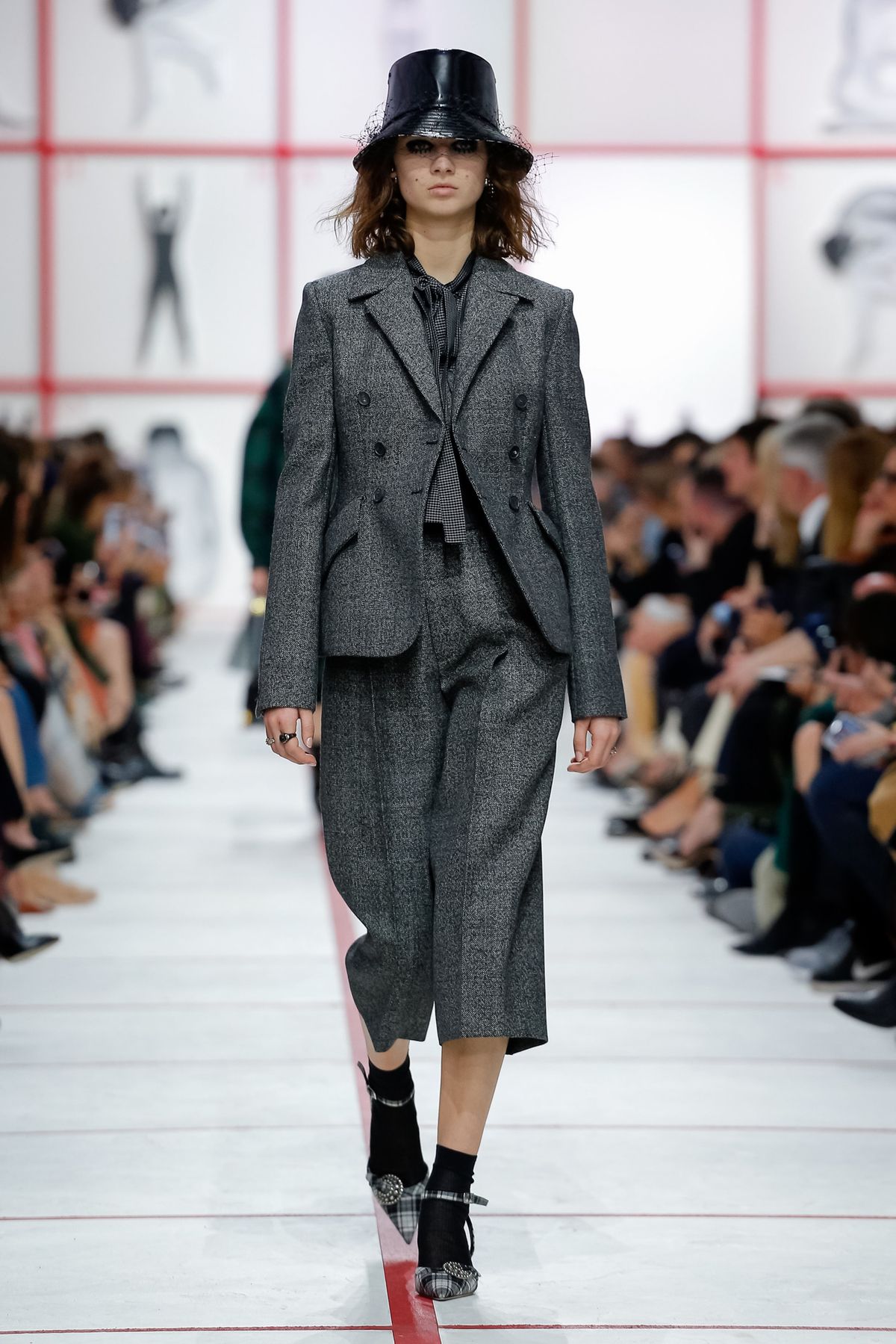 Na passarela, Maria Grazia traduz todas estas influências com uma silhueta que caminha com diversos xadrezes, em seda, algodão, lã e cashmere. Os bicolores mary janes à lá oxfords dão peso às saias de tule sucesso de Grazia na maison. E que tal um colar de pérolas acorrentado e colado na garganta que remete diretamente à mulher no trono inglês? Sim, é com essas sutis subversões que a moda da Dior se mantém jovem e fresca, e até mesmo do clima instável londrino, com seus chapéus de pescador envernizado amarrando essa proteção feminista, bandeira frequente e importante que a mulher à frente da tradicional casa francesa faz questão de levantar.