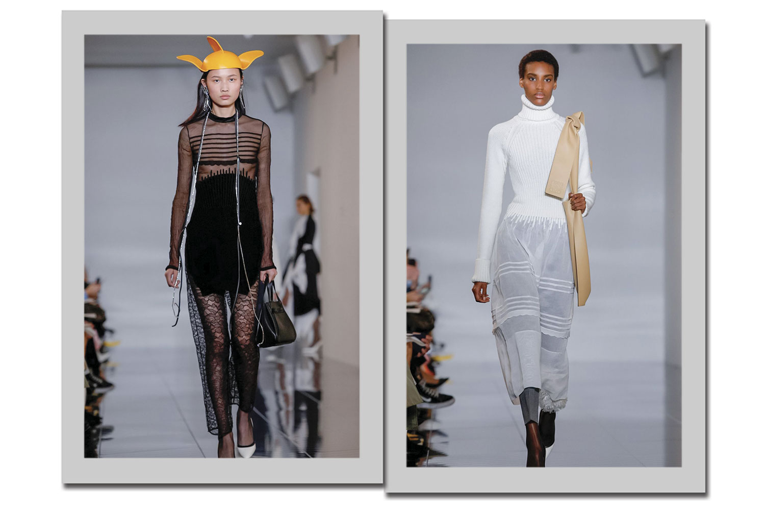 6. A transparência aparece para sensualizar as peças da Loewe. No look all white ela aparece tímida, fazendo sobreposição com a calça cinza de alfaiataria.