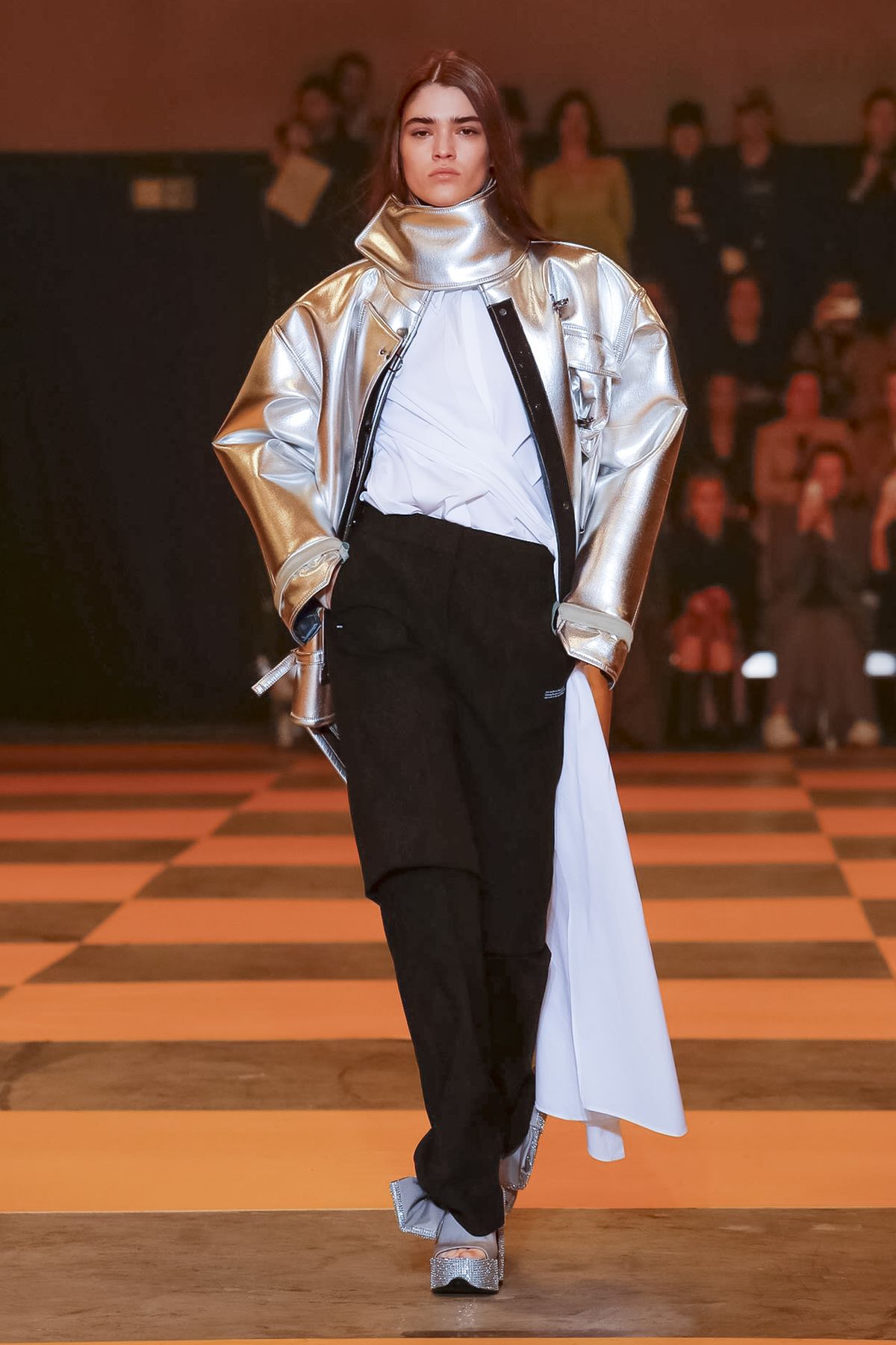 3. A jaqueta prata é uma peça statement.
