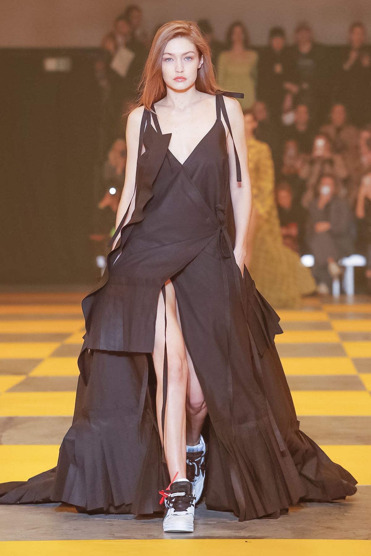 8. Gigi Hadid cruzou a passarela com um vestido preto de babados e pregas.