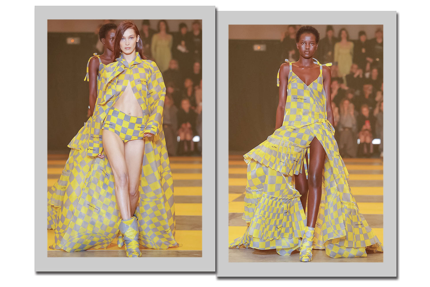 9. Os vestidos quadriculados em cinza cinza e amarelo são as peças que traduzem todo o desfile para a moda.