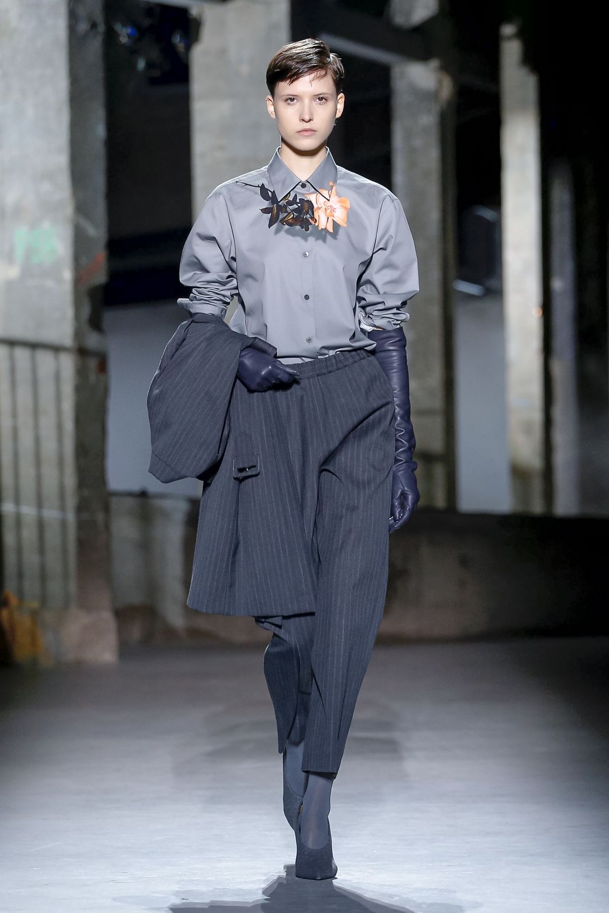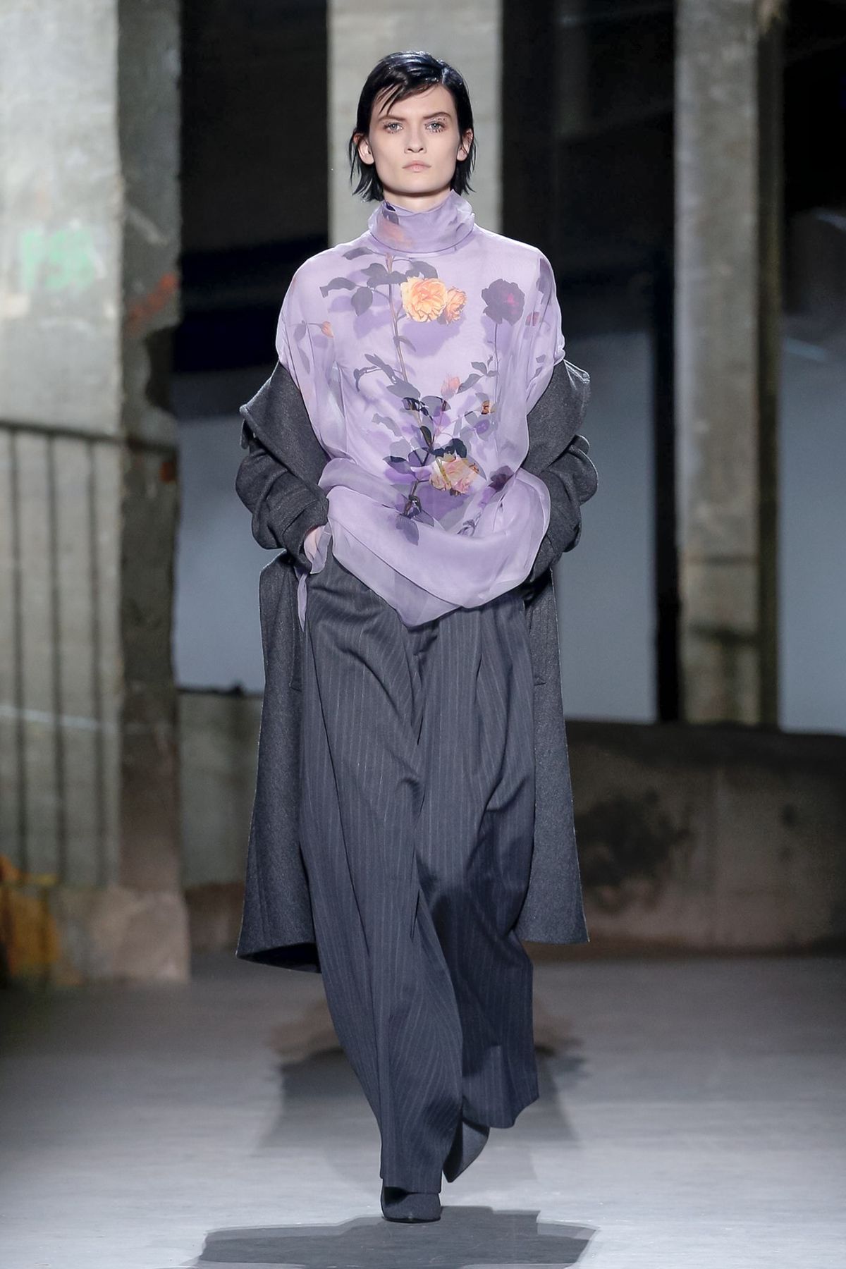 A alfaiataria de Dries Van Noten é enriquecida pelo styling dos looks para o inverno 2019 da label, apresentado nesta quarta-feira (27.02) na semana de moda de Paris. As cores nascem das peças cinzas, em formas de flores. As “candy colors” adicionam leveza às criações do estilista, que transmitem poder. Tons terrosos aparecem tímidos, mas pontuais. Alguns acessórios transparentes finalizam os looks, enquanto as bolsas já desfilaram na passarela como it bags.