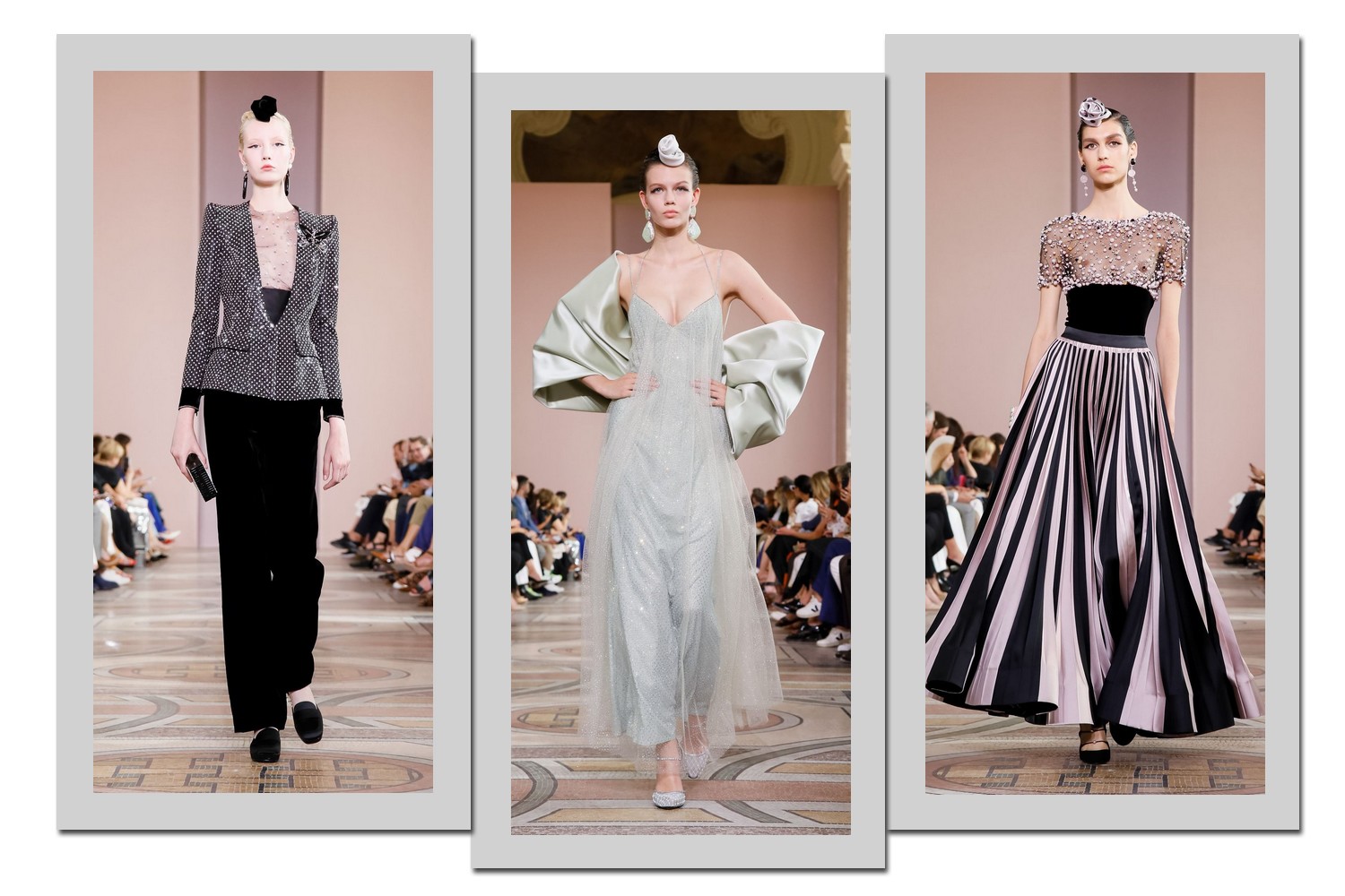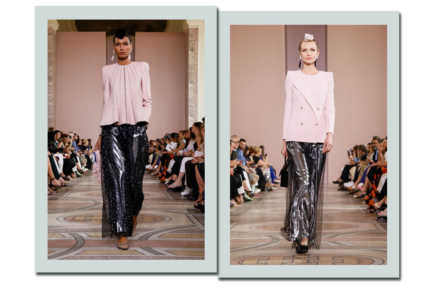 Os tons pastel – como verdes, rosas e azuis – invadiram a passarela da Armani Privé e contrastam com o preto, que domina a paleta da coleção.