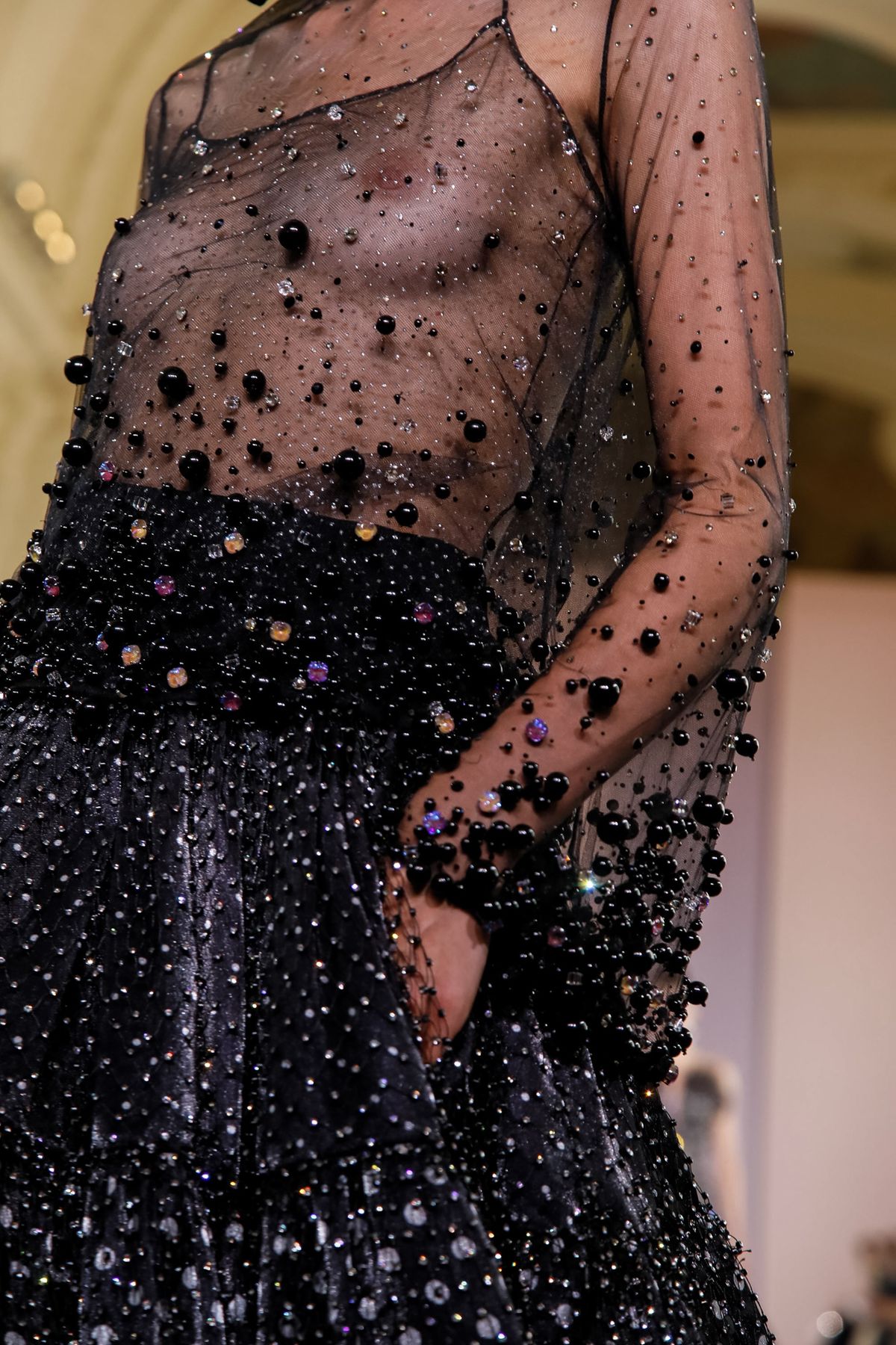 As aplicações de bordados, pérolas e brilho deram o toque artesanal e manual aos casacos e blazers de festa. Os longos ganharam decotes profundos e transparências, inclusive em uma série de tules e tafetás em tons pastel, que arrancaram suspiros da plateia. Veja dez coisas que amamos no inverno 2020 da Armani Privé: