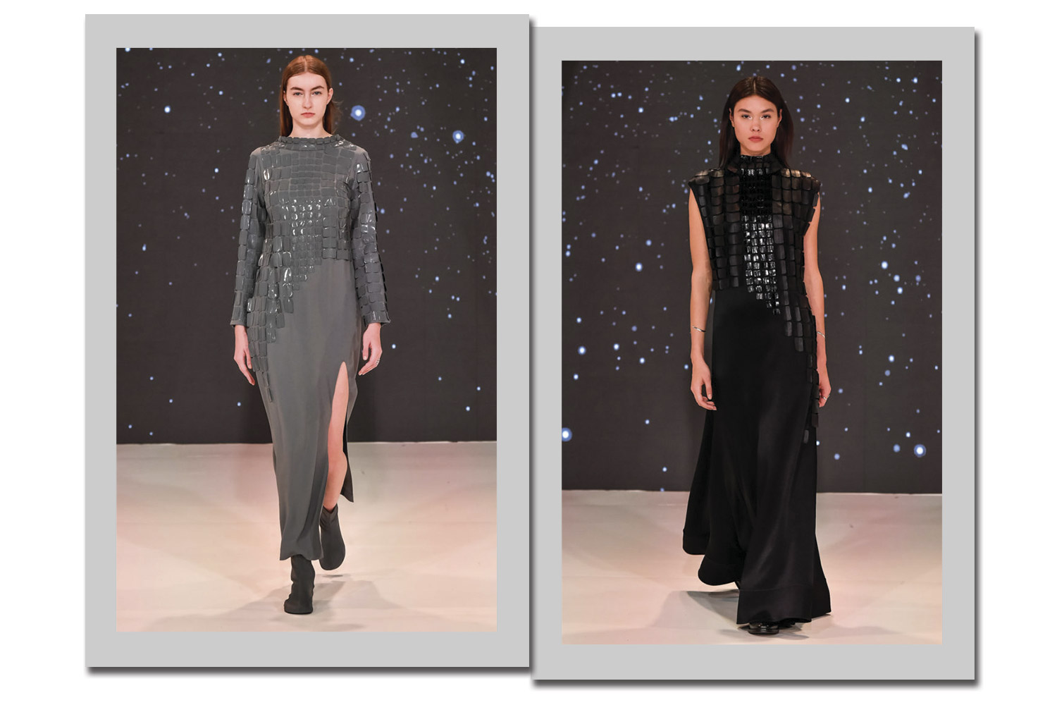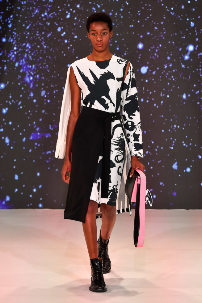 Os metalizados de ares espaciais são combinados a sapatos bicolores clássicos da marca, mas também botas feitas em parceria com a Louies amarram o mood da coleção. Adoramos as interpretações dos dragões na passarela, desde as bolsas box com print do ser imaginário, até na técnica marca registrada da estilista de bordadar retângulos, desta vez em couro sintético envernizado para dar aspecto escamoso aos vestidos supersofisticados que fecham o desfile.