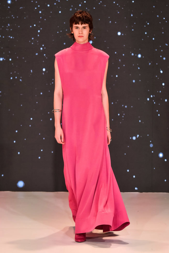Em uma coleção bem sisuda, marcada pelo preto, o rosa shocking traz uma luz impressionante para a passarela.