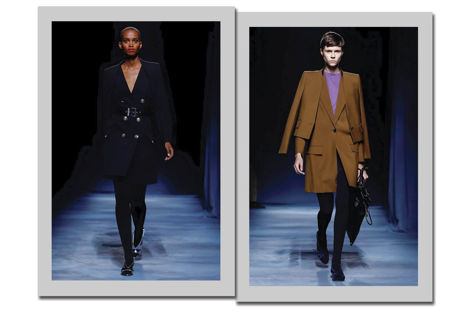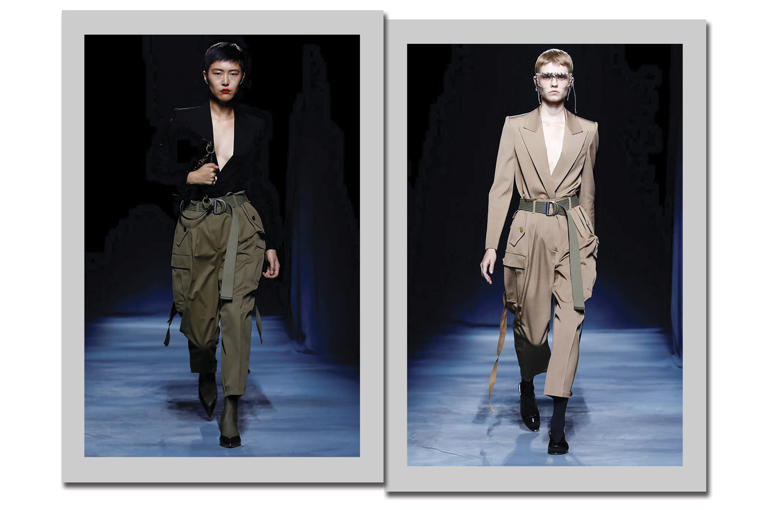 Clare Waight Keller alonga o blazer e o transforma em vestido, ora com dobraduras nos ombros, ora com um segundo blazer acoplado na mesma região.