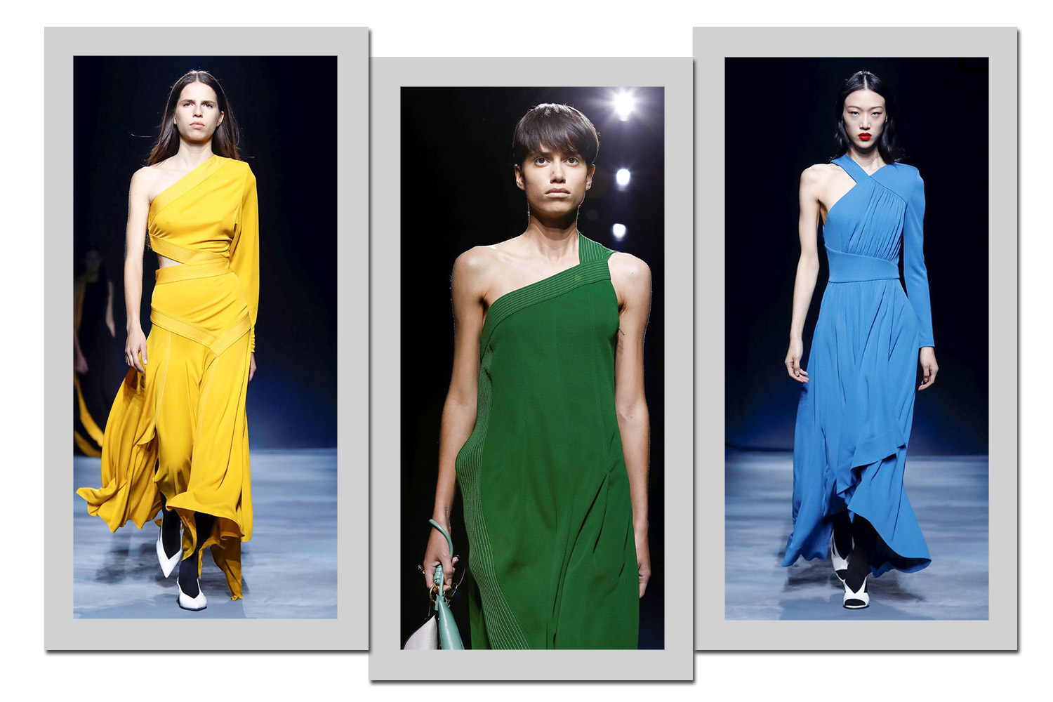 Boa parte dos vestidos da grife são monocromáticos com um detalhe muito charmoso: o decote de ombro só.