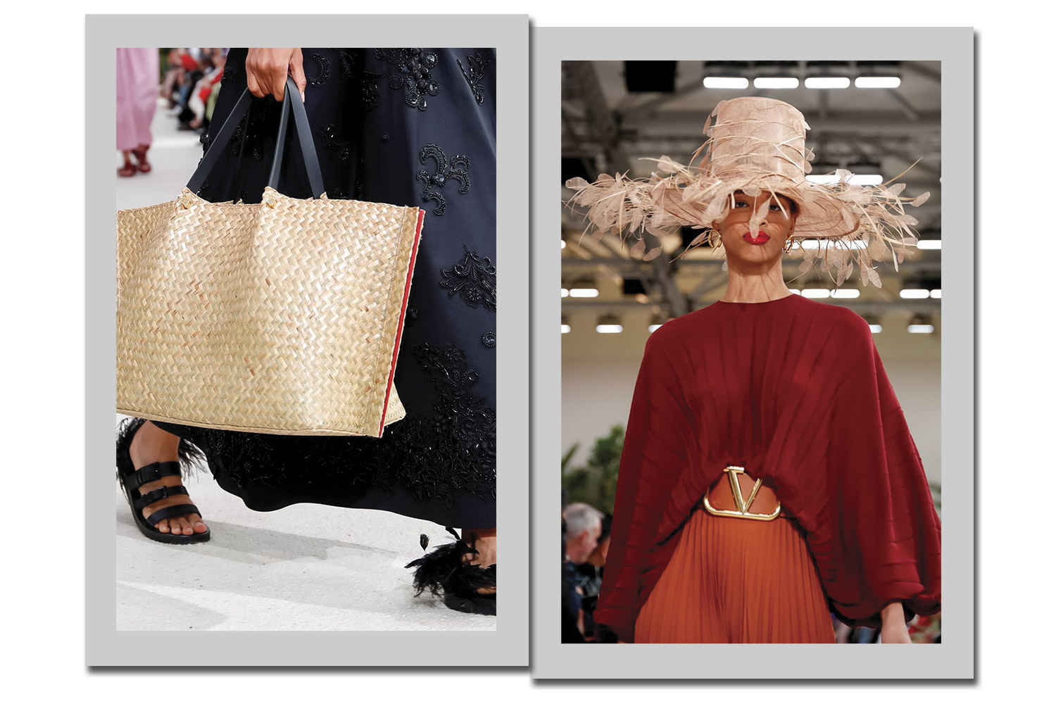 Verão pede palha e outros materiais artesanais em acessórios. E eles aparecem na coleção da Valentino em diversos momentos, como o maxichapéu que roubou a cena, e a bolsa de praia.