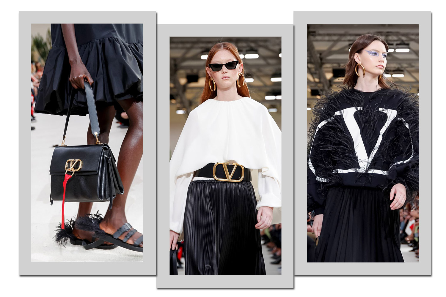 A logomania da Valentino é bem discreta. O “V” símbolo da grife aparece principalmente em acessórios, como cintos e bolsas, e decora dos moletons da temporada.