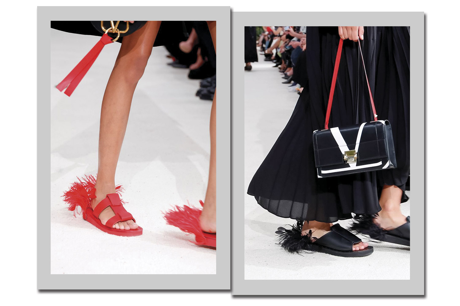 O esportivo tem peso e ganha aplicação de plumas inclusive em acessórios como sneakers e rasteiras, que já saem da passarela sendo puro desejo.