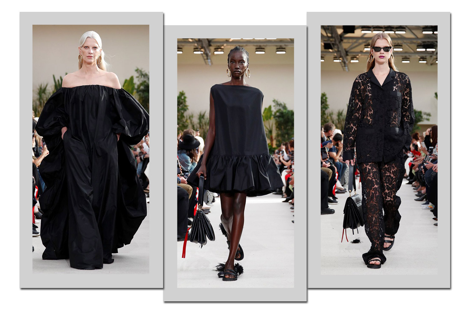 A primeira fase do desfile vem toda em preto, com looks volumosos ou em renda.