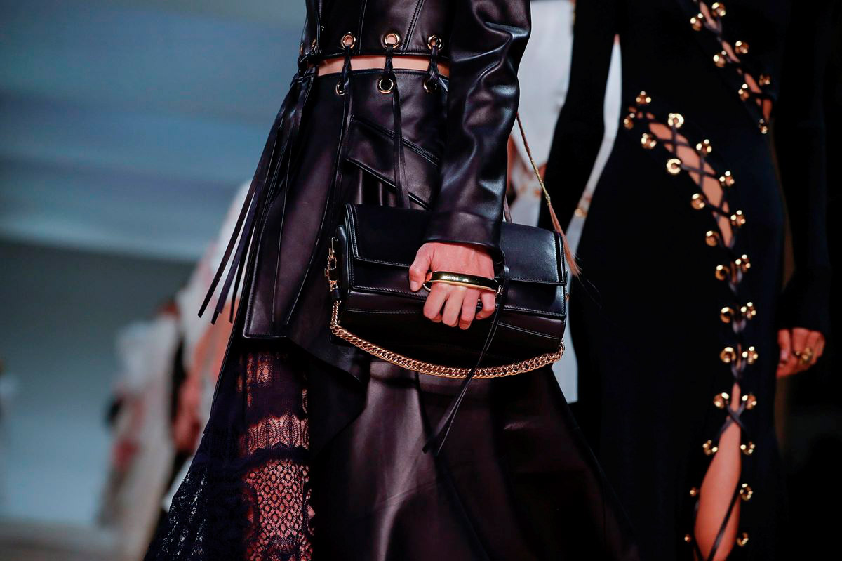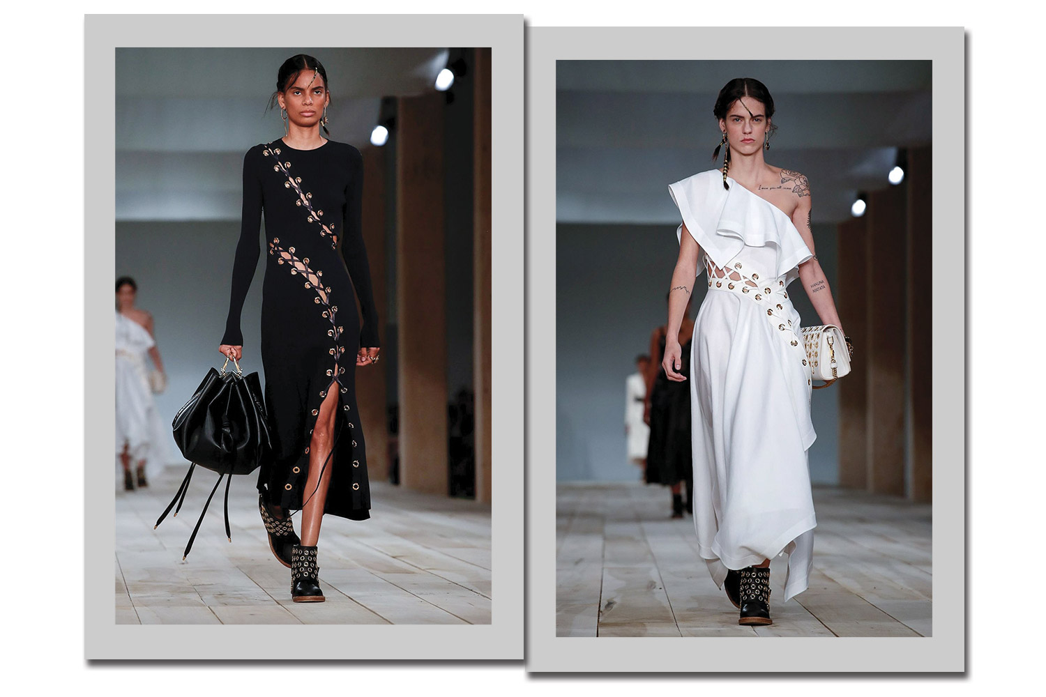 Sempre trabalhando com couro, um dos seus materiais preferidos, Sarah Burton apostou no vestido com recortes estratégicos em duas versões: preto e branco.