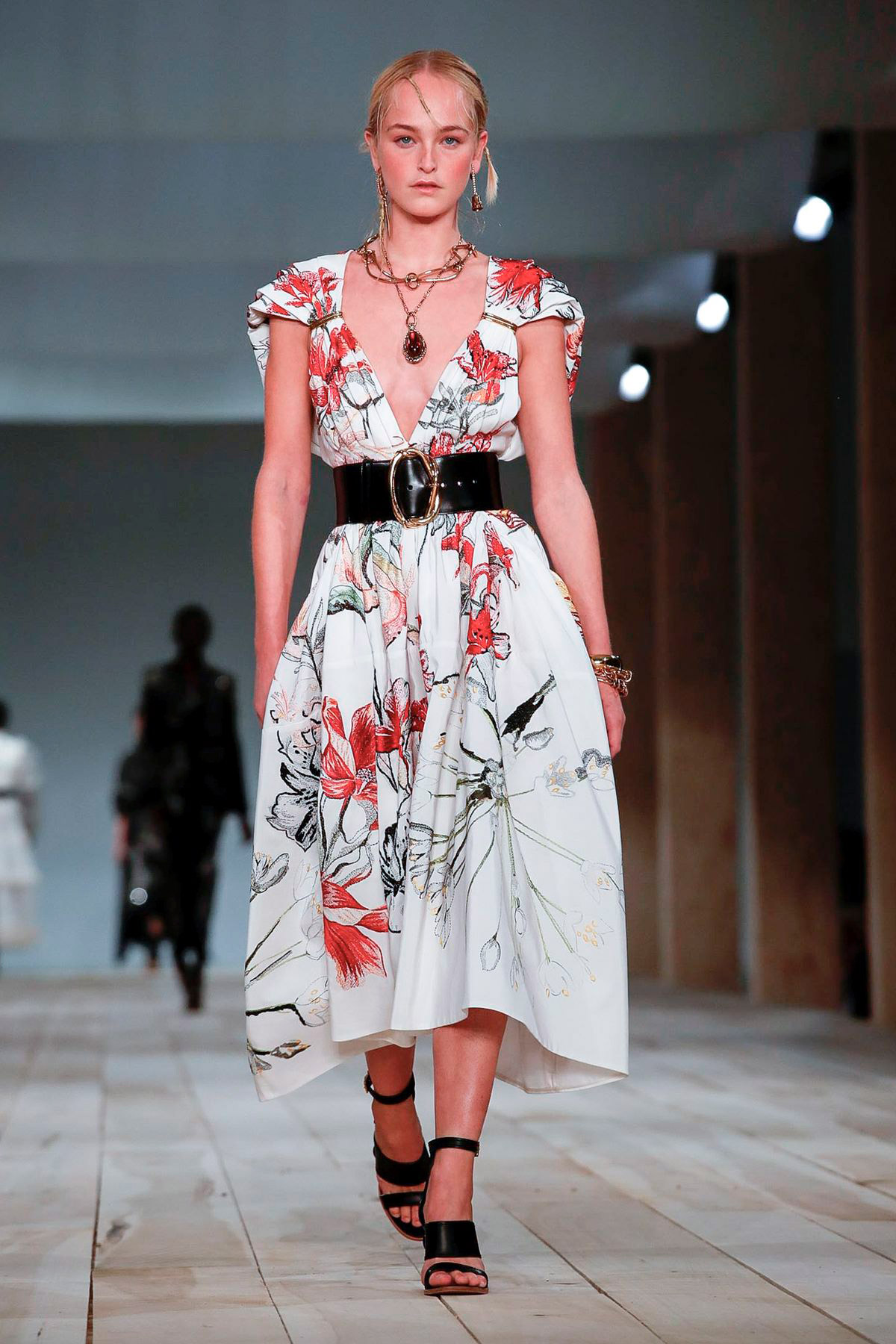 Sarah Burton escolhe para a cartela de cor o clássico preto e branco, além de pinceladas dos tons de vermelho, que aparecem no motivo floral. A renda, o tule e alfaiataria constroem looks impecáveis, que são um must para os amantes da moda típica londrina.