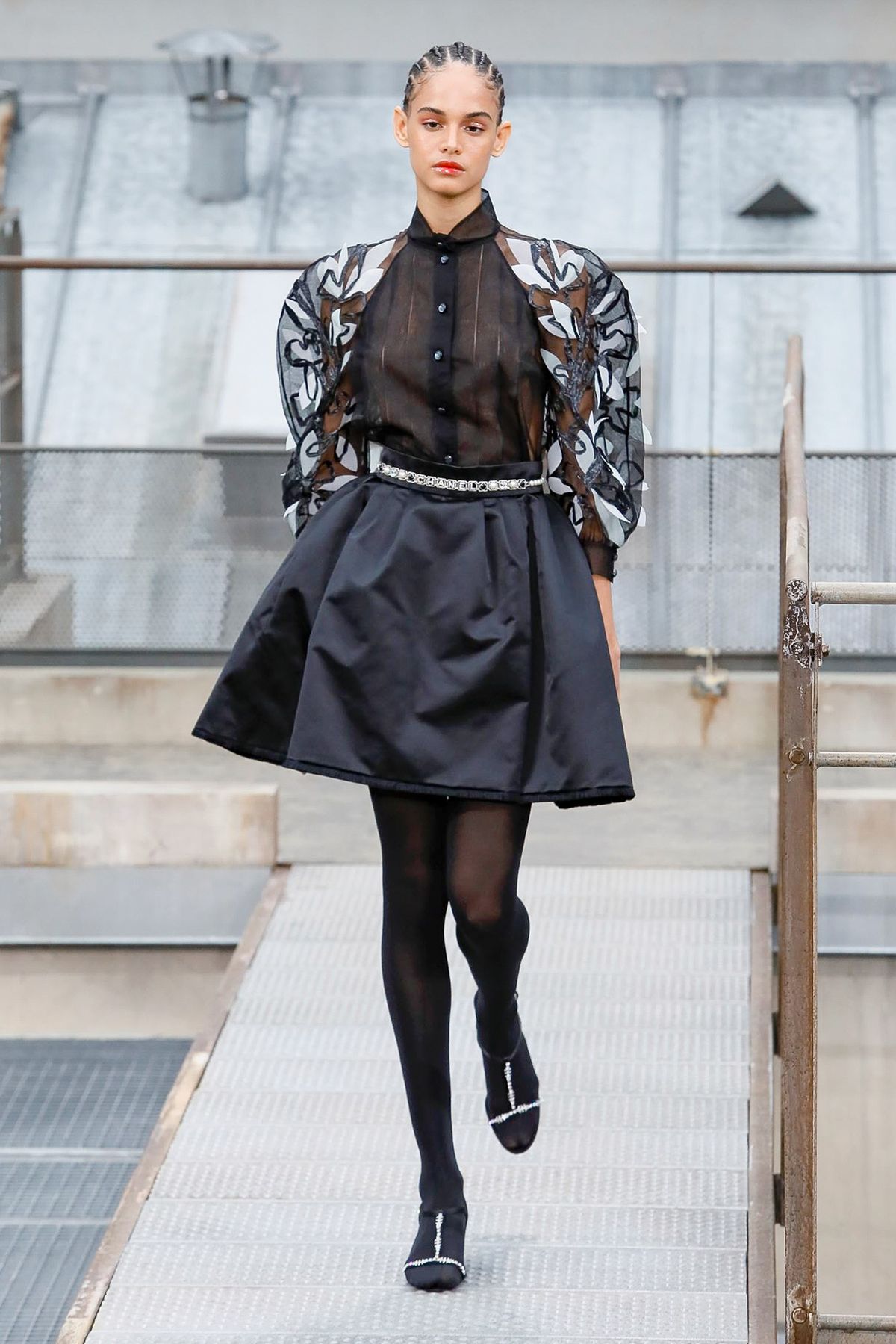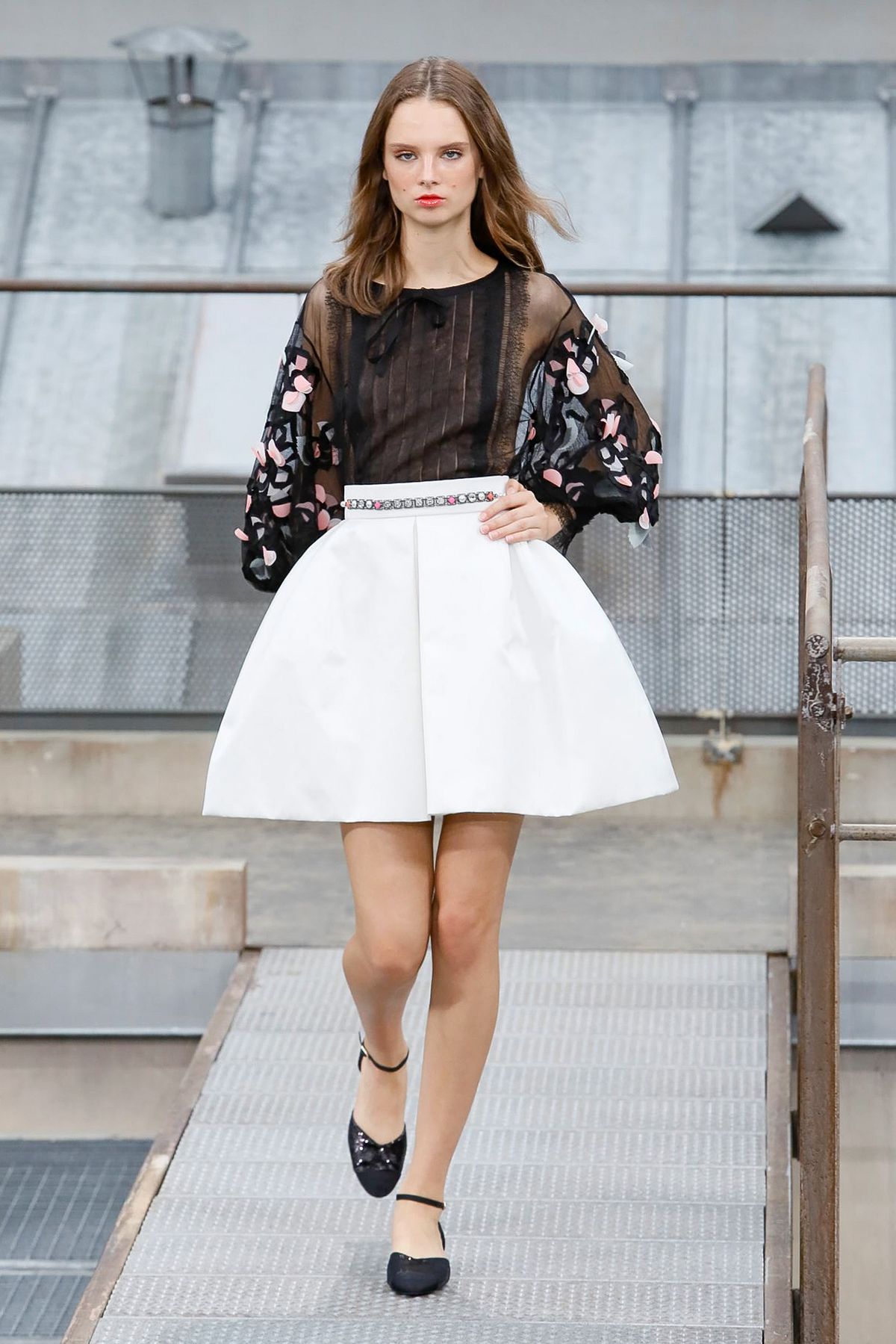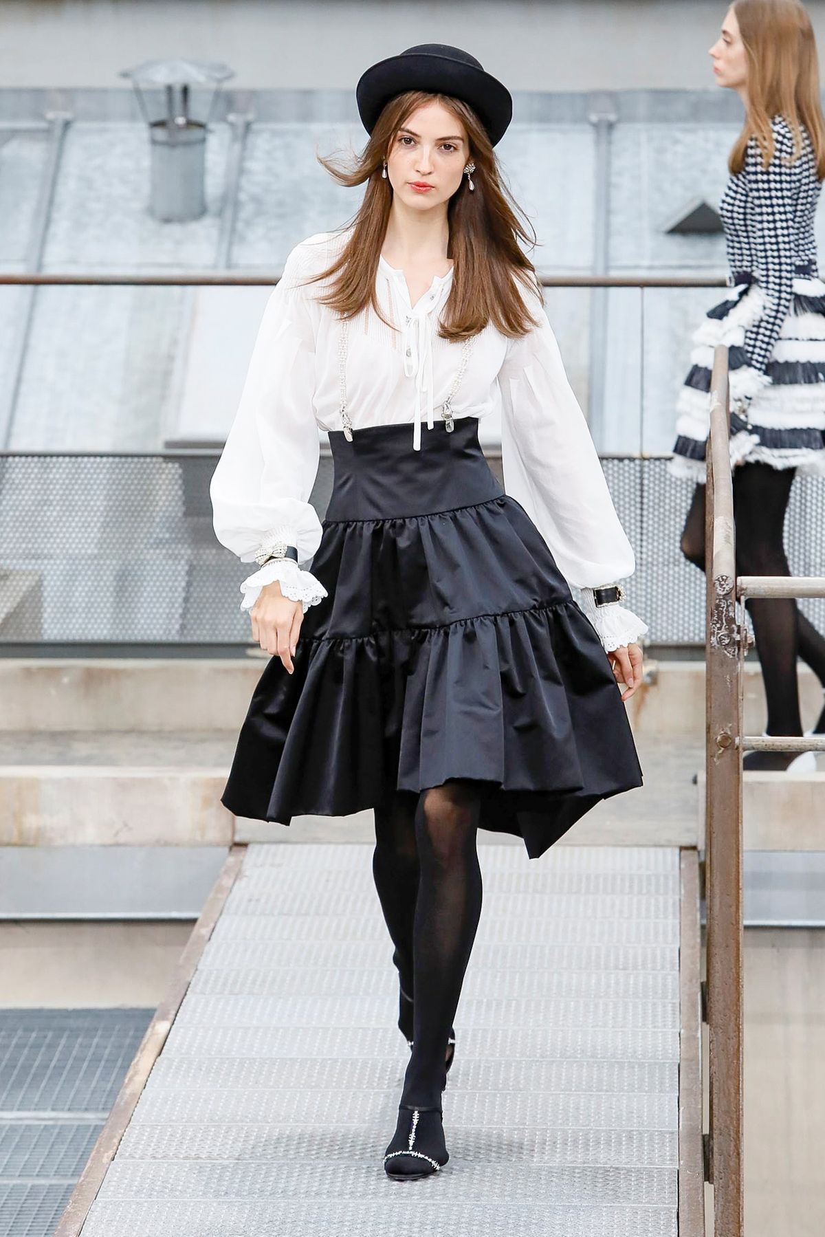 O preto e branco não poderia faltar na passarela de verão 2020 da Chanel. Com bossa, a bata branca foi combinada com a saia rodada e é um look incrível para passear por Paris.